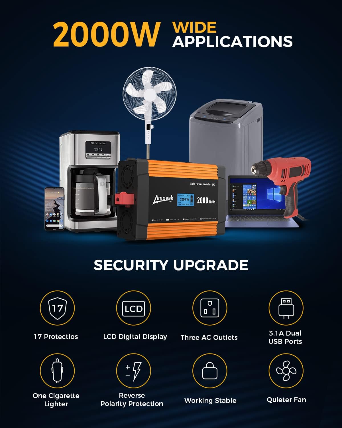 - High Value Ampeak 2000w inverter 12v DC to 110v AC: Inverter provides 2000W of continuous power, 4000W of peak power, and converts 12V DC battery power to 110V AC.Each unit offers 2 USB ports (3.1 Amps each), 3 AC outlets(each outlet support 2000w,need consider efficiency), a DC cigarette lighter, and 3 Feet of 4AWG Battery Cables.