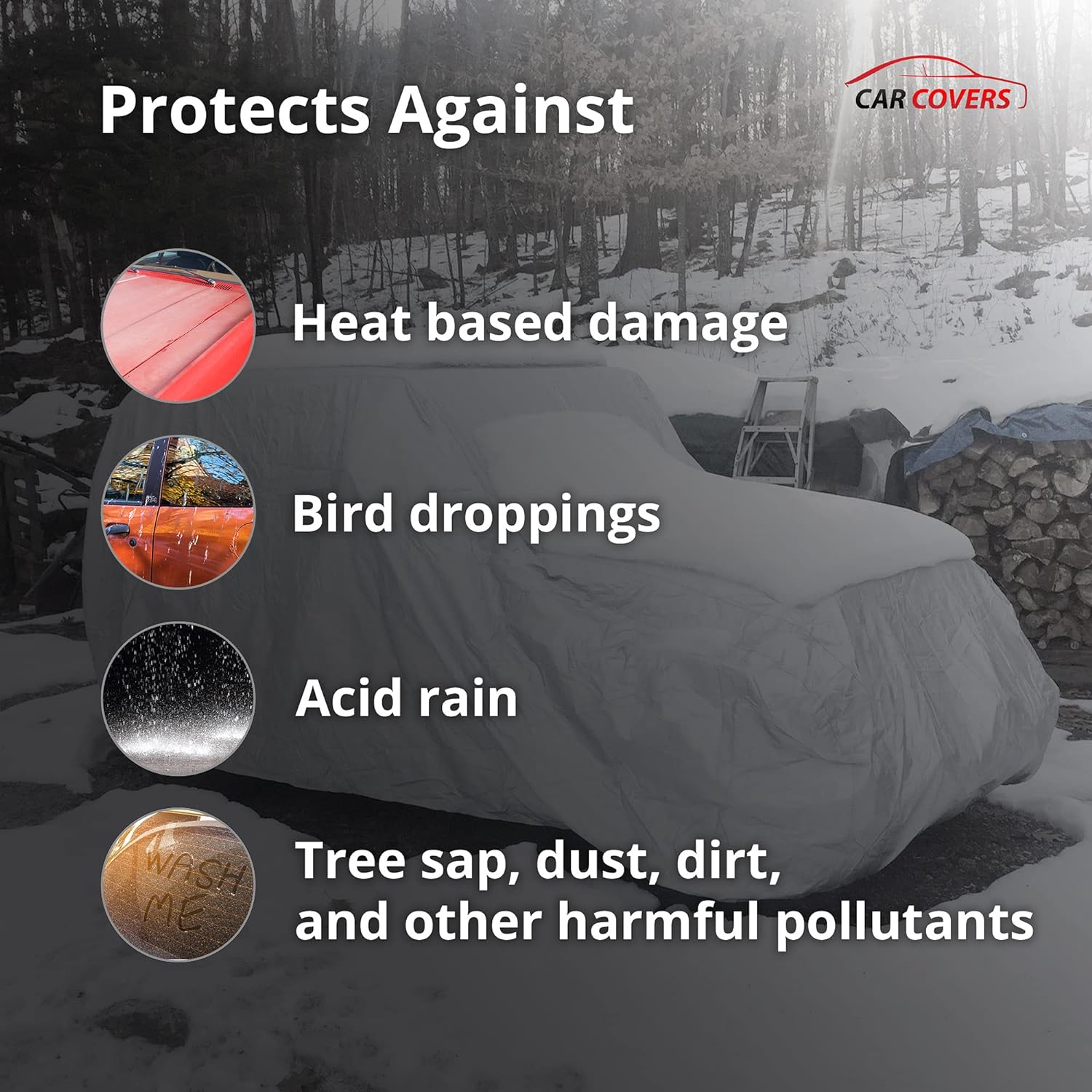 - YEAR-ROUND PROTECTION PREVENTS DAMAGE: Specially made full exterior covers for all indoor and outdoor elements, our top-quality multi-layer car covers feature breathable interior fabric with double stitched, welded, and reinforced seams and an ultra soft fleece inner lining to protect paint and to ensure your vehicle’s surface finish stays in pristine condition.