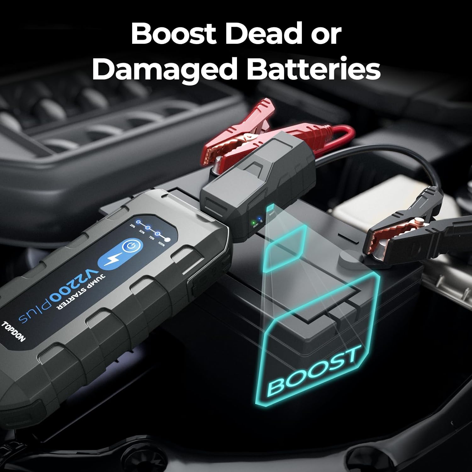 - STARTS DEAD BATTERIES: TOPDON V2200PLUS This powerful 2200 Amp lithium battery starter will bring almost any 12V lead acid battery back to life in less than 1 second. It can jump-start vehicles with up to 8.0L gasoline/6.0L diesel engines and can provide up to 35 jumps on a full charge.