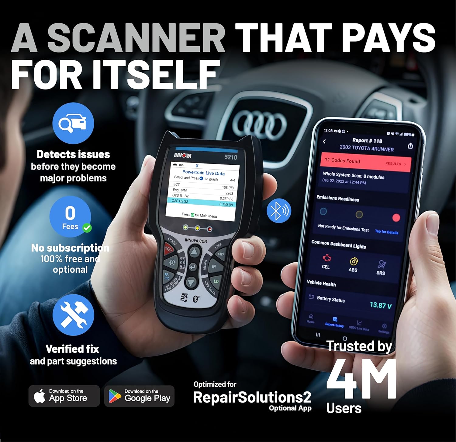 - NO SUBSCRIPTIONS โ VERIFIED FIXES WITH FREE APP โ Unlike other OBD2 code readers, the INNOVA 5210 provides verified fixes based on real-world repairs from ASE-certified mechanics. Trusted by 4M users, the RepairSolutions2 app on iPhone & Android gives you step-by-step repair guidance, suggested parts, and cost estimatesโno extra fees or hidden subscriptions!