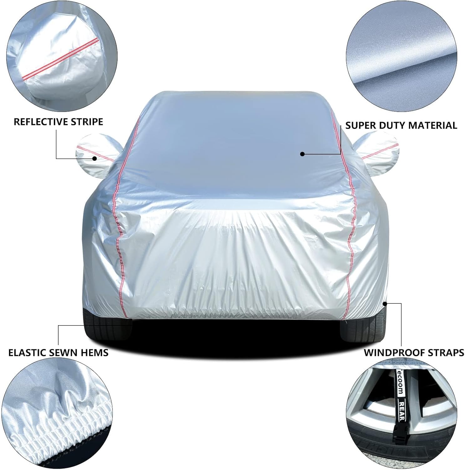 - 【Professional Design】1. unique door zipper on the driver's side for quick and convenient access. 2. windproof straps & elastic hem at front and rear to protect your car cover from blown away by heavy wind. 3. equipped with combination lock, security anti-theft. 4. full-range reflective stripes remind others at night. 5. mirror pockets make the cover more suitable.