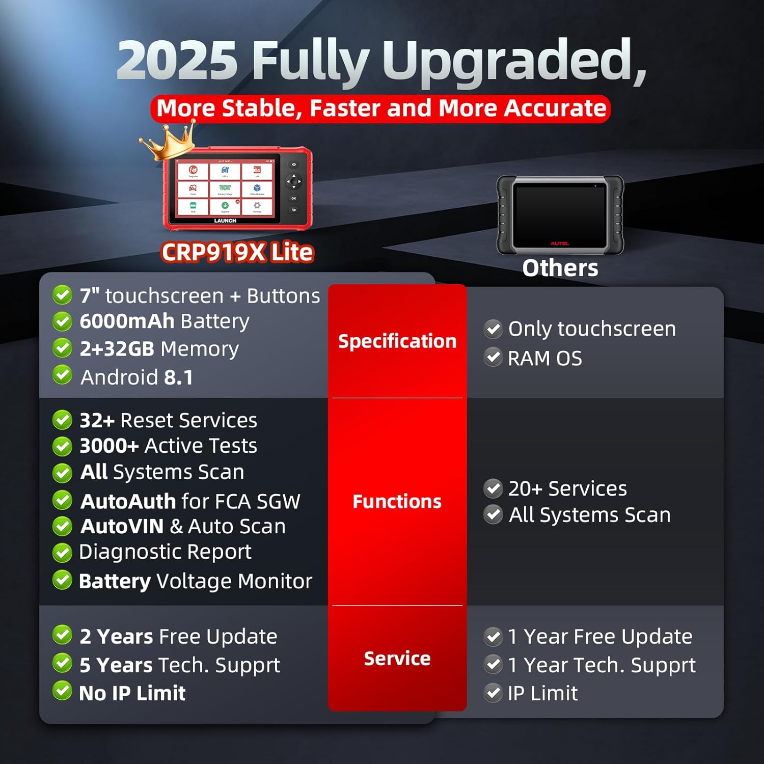 - 👍【Newly Added Actuation Tests】launch crp919x lite is new for 2025, becoming the most cost-effective bidirectional tool at just over $300! We add an essential feature to the original tool that most technicians need: actuation tests; It can send commands to the ECUs of actuators for functional tests and work status checks, such as modulating windows, rear mirrors, wipers, horn test, and throttle etc. ✅Quickly identify problem components without disassembly, turn your business to fast lane.