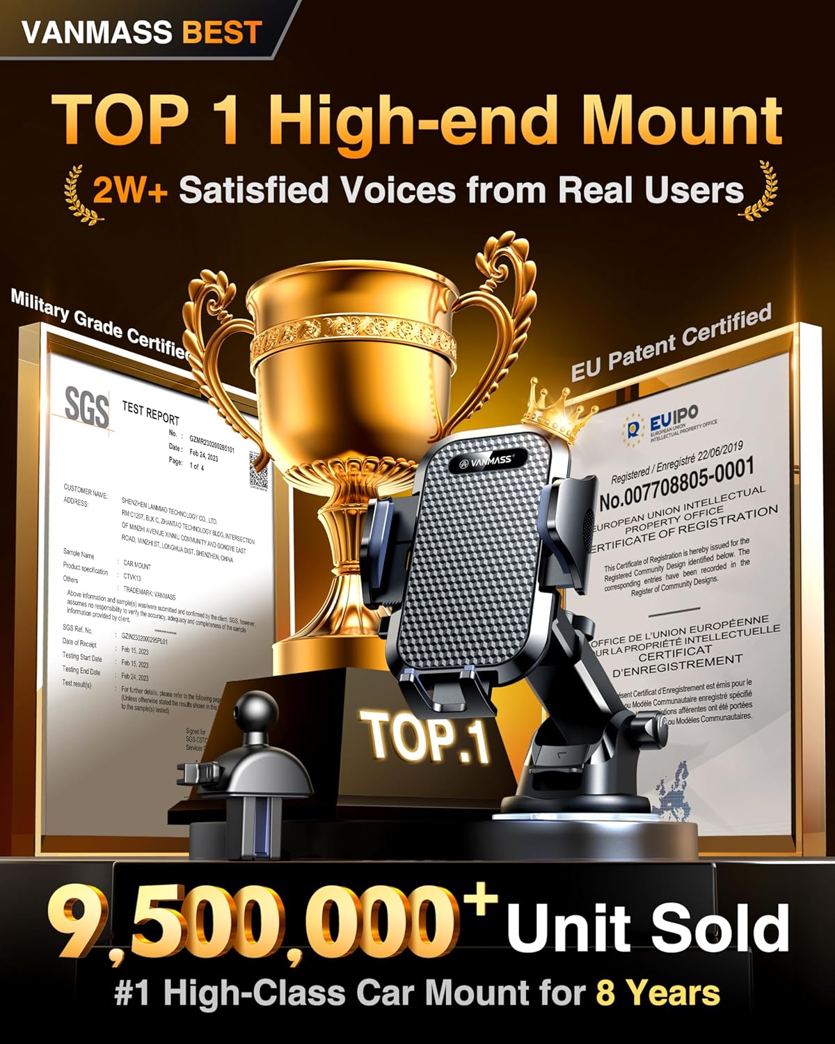VANMASS Car Phone Holder 2025 Military-Grade Phone Holder for Your Car Windshield Dashboardใ 65 Lbs Strongest SuctionใใPatent & Safety Certsใ Universal Cell Phone Car Mount for iPhone Samsung Android