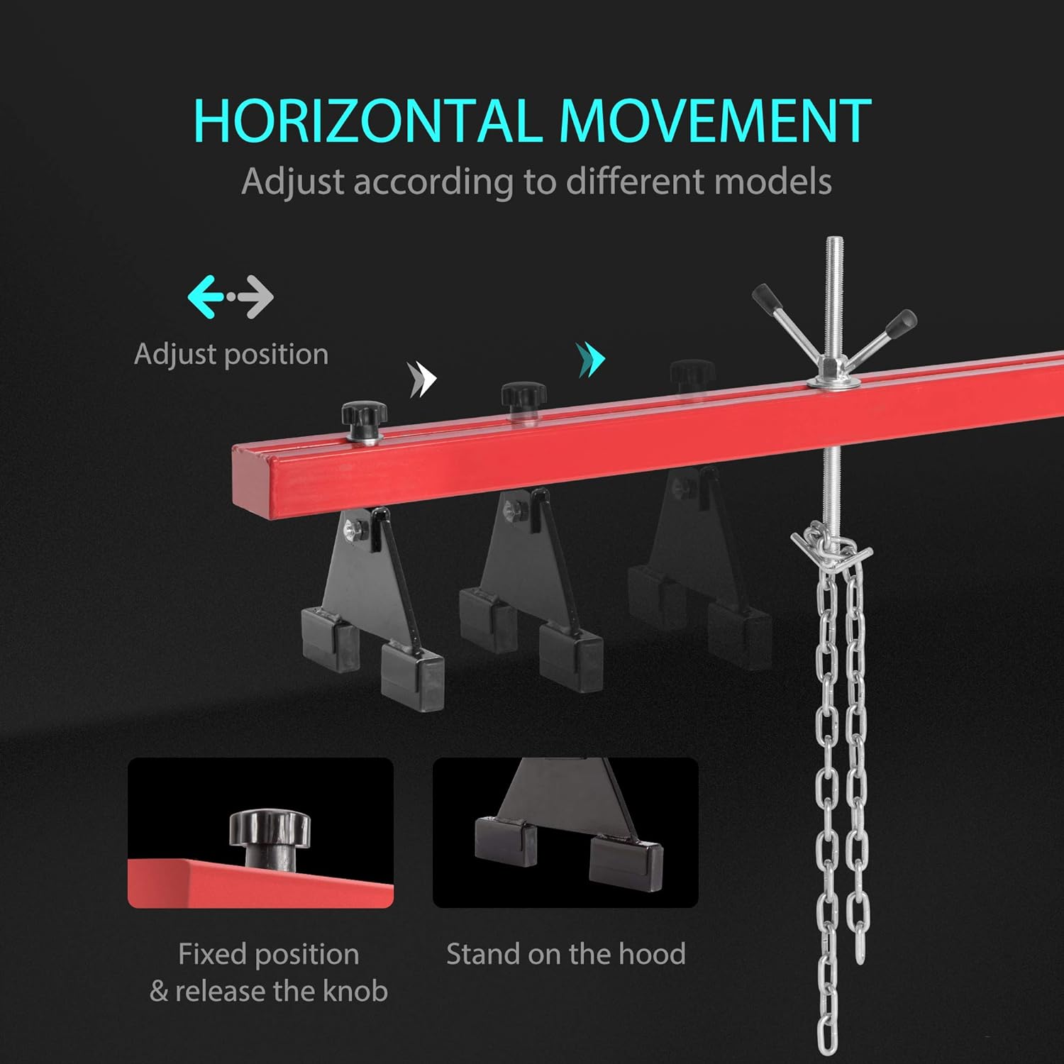 - ACCURATE FINE-TUNING HEIGHT - The lifting height of 2 rotating hoists on the engine holder bar can be adjusted from 0 to 7.9 inches, and it is available to maintain altitude for a long time; Equipped with a knob and stable triangular base on each side, the range between the 2 bases can also be changed from 21 to 59.1 inches, so it applies to vehicles that width is less than 59.1 inch