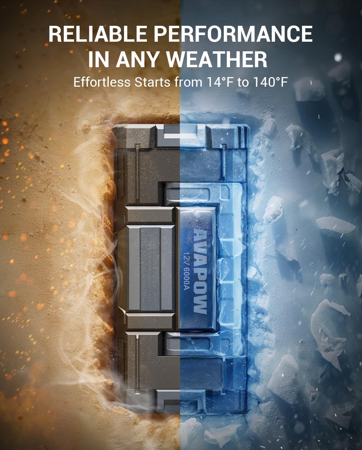 - Ground breaking 2-Second Start: Jump-starts your car in just 2 seconds, even with a fully drained battery. The A68 portable car jump starter delivers 6000A peak current, supporting all gasoline and up to 12.0L diesel engines οΌIt is suitable for all ( (12V vehicles)) cars, trucks, motorcycles, boats, RVs, tractors, ATVs, UTVs, lawnmowers, snowmobiles, etc. Meanwhile, it is ultra-lightweight and portable.