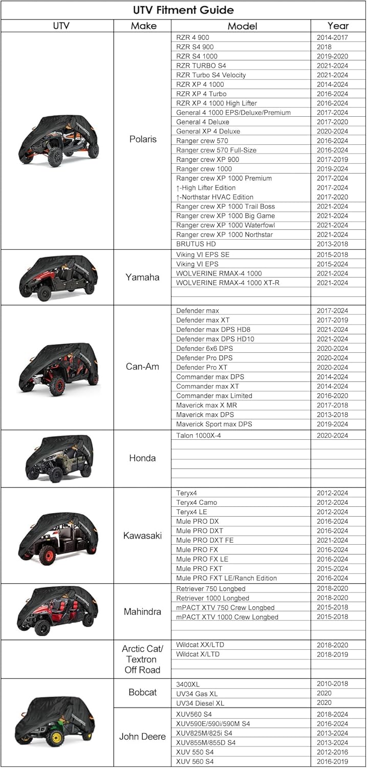 - Fitment Models: Compatible with Polaris RZR XP 4 Turbo S Yamaha Viking Can-Am Defender Maverick X3 Max Arctic Cat Wildcat Textron Off Road Mahindra Retriever (Picture 2 ). Please note that : Before purchasing, please refer to the models picture to make sure fit or not. If have any problems, We provide professional online service for pre-sale and after-sale