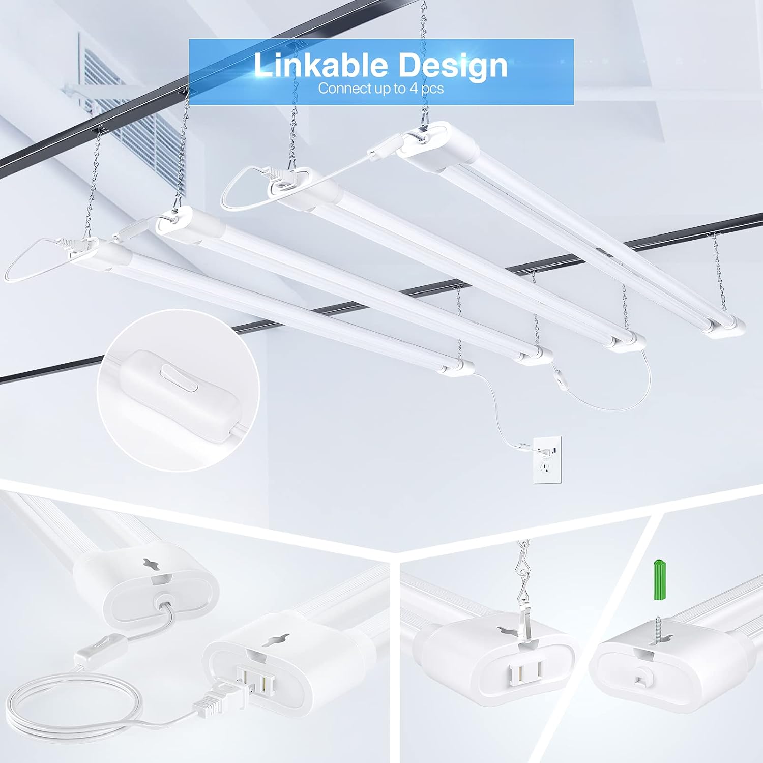 - đź’ˇEasy Installation - Plug & Play. These 4ft led shop lights can be directly mounted to the ceiling or suspend from the ceiling in your garages, workshops, basements, warehouse, etc. Hanging chains and mounting screws are both included. Quick and easy setup.