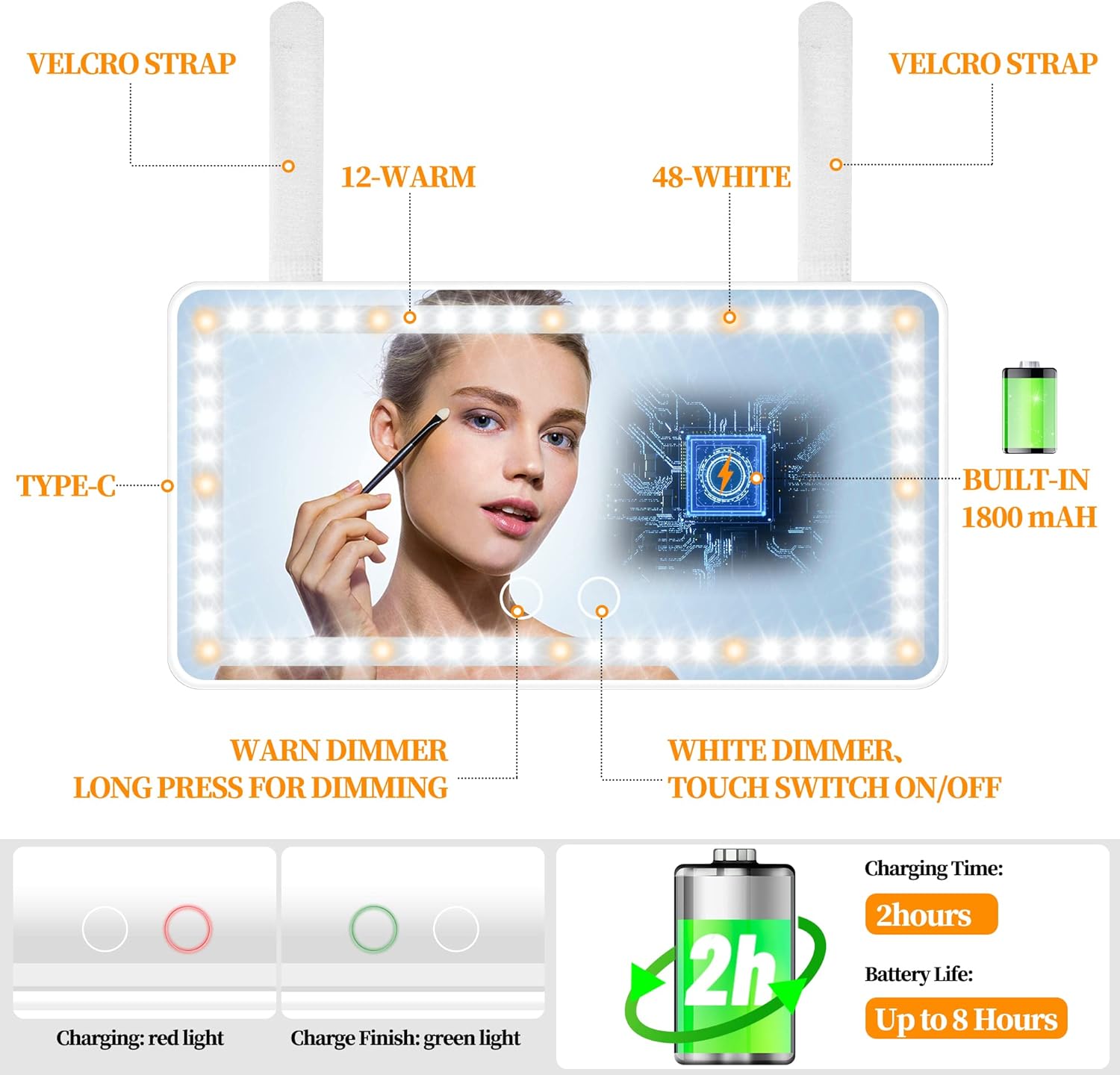 - USB POWER SUPPLY AND BUILT-IN LITHIUM BATTERY: The car mirror is powered by lithium battery or USB cable, which can be charged through the socket, computer, mobile power, free to use the vanity mirror with lights at anywhere and anytime. 2000 mAh rechargable battery we used You could use it for 8 hours without charging it, Calculated by using 30 mins per day, the lithium battery can be used for at least 10 days with one charge