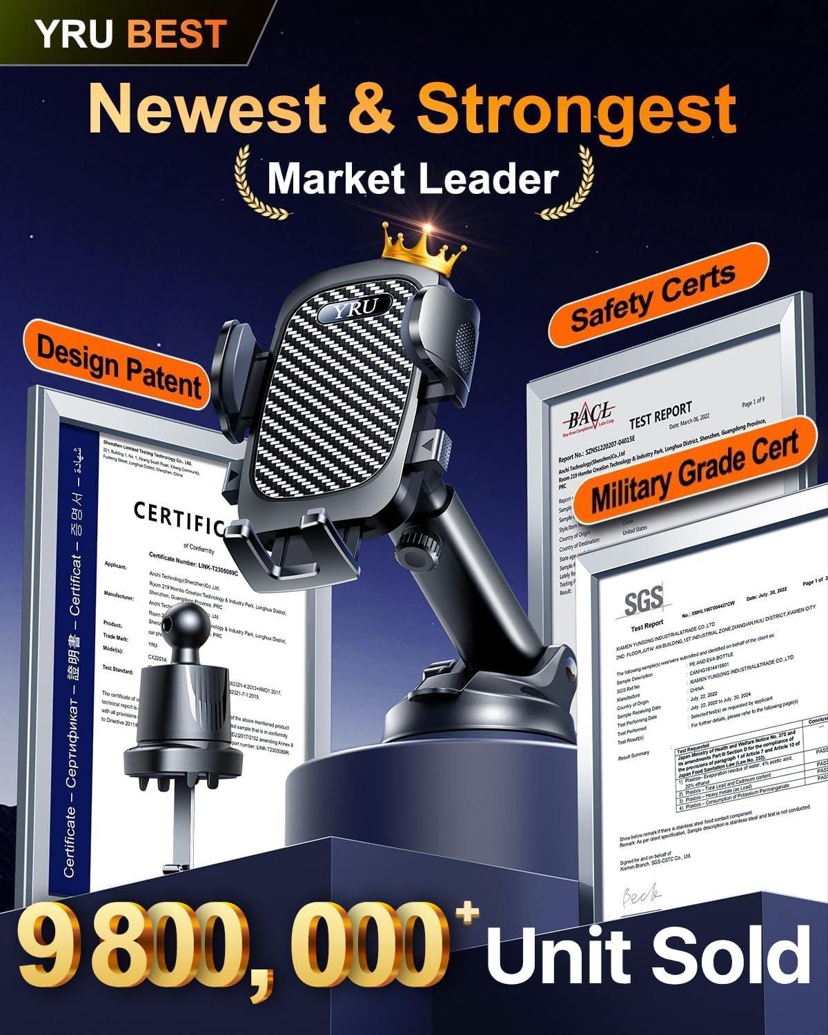 - ใTrue Military-Grade Certified, 2025 Ultimate Car MountใSince 2010, YRU has been devoted to R&D High-end Car Mounts. Over the past 15 years, we listened to millions of users' voices, and rigorously tested to MILITARY GRADE Standards (stability, compatibility, flexibility, security, durability, ease of use). Finally, we made this BEST Version in every aspect. Certified by All Safety Agencies: Military-grade Shockproof, RoHS, CP65, REACH.