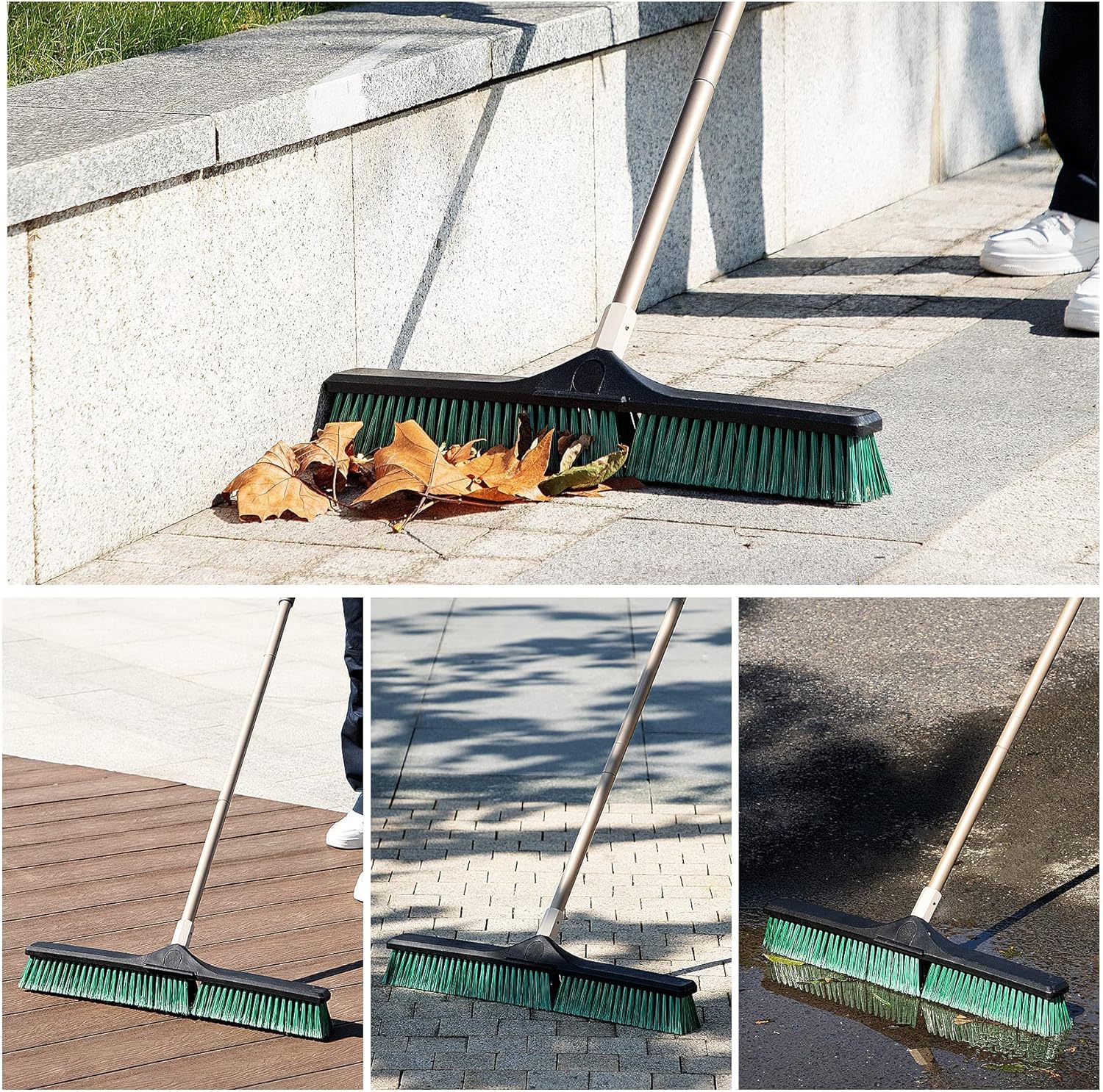 - ă2-Section Interlocking Broom HeadăThe 24 inches wide Double-layer Bristles broom could be used in both dry and wet floor condition, The 2-section interlocking convenient for storage the brush head, has soft outer green bristles that sweep up catch small fine dirt particles like dust, wooden chips, hair, while sturdy inner black bristles sweep away large debris or difficult to remove stains.