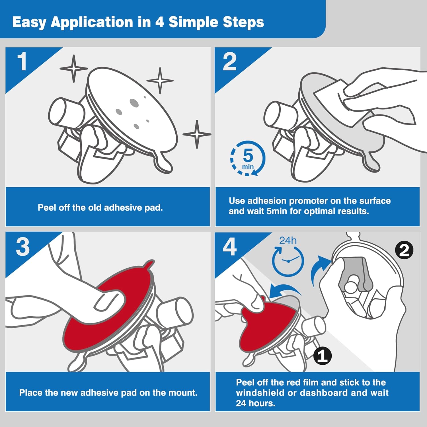- Easy Installation – For best results, thoroughly clean and dry the surface before applying. Use adhesion promoter on the mount surface, press at least 30 seconds, and wait 24 hours before use for maximum hold.