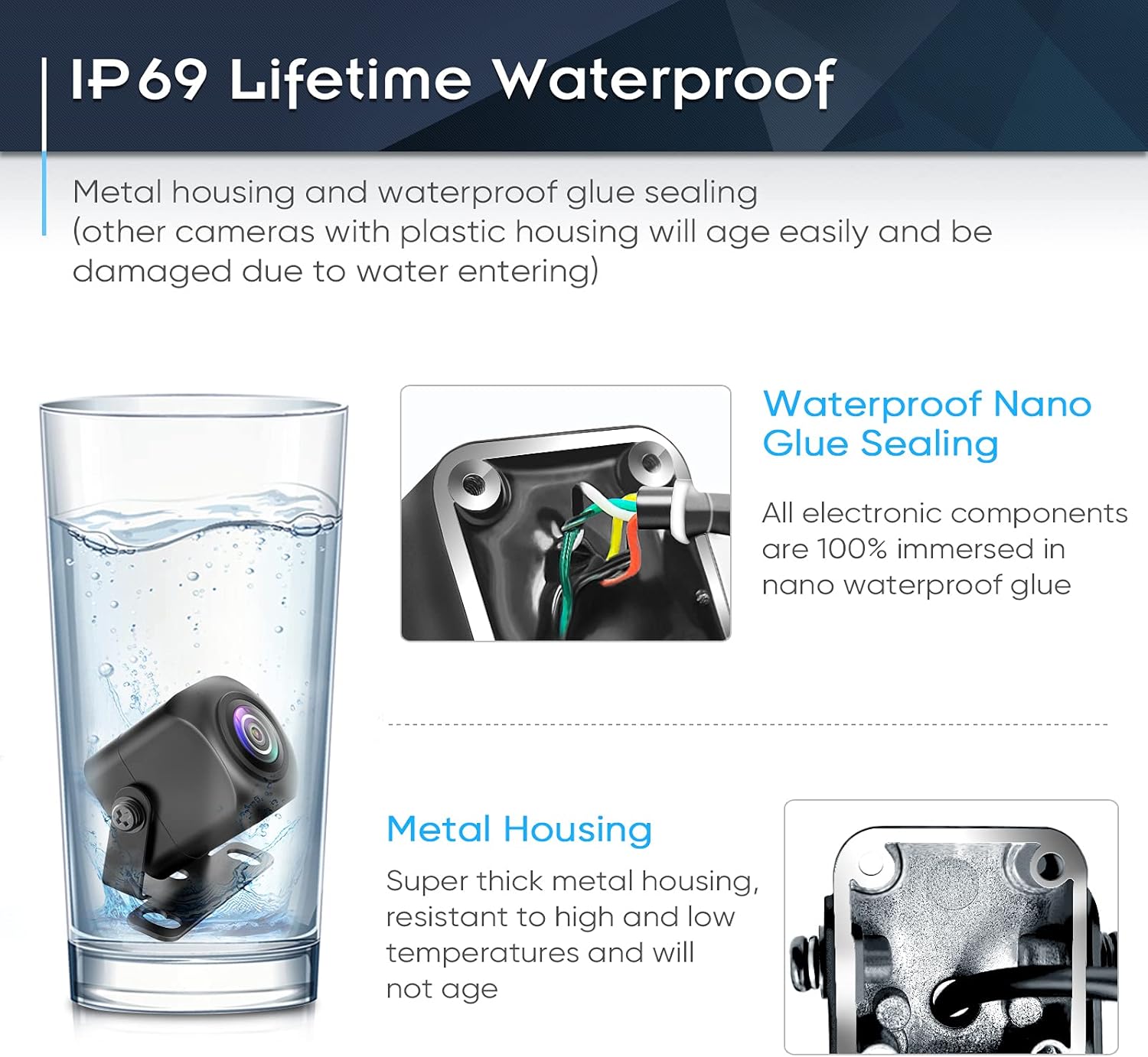 - ăSturdy Alloy HousingăFirst put the lens and PCB in the alloy housing, then fill and seal with Nano waterproof glue, in any weather, high or low temperature, PMD2A-S reverse camera is waterproof for lifetime. In the unlikely event of water coming in, we will provide a brand new backup cam for you.