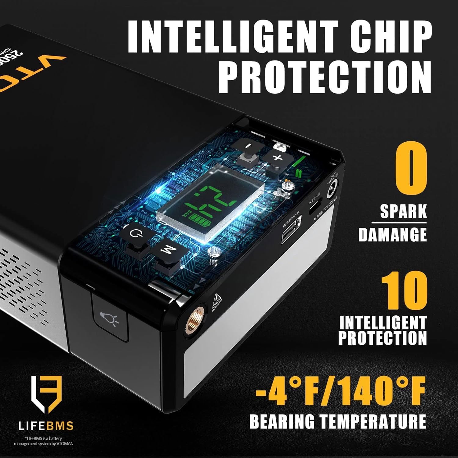 - 【Powerful Start-Up Performance】The VTOMAN X1 car jump box equipped with a 2500A Peak current and can instantly start 12V vehicles (8.5L Gas/6.0L Diesel engines). Even in extreme temperatures, this car battery jump starter can start the car up to 50 times and has a service life of more than 1500+ recharge cycles.