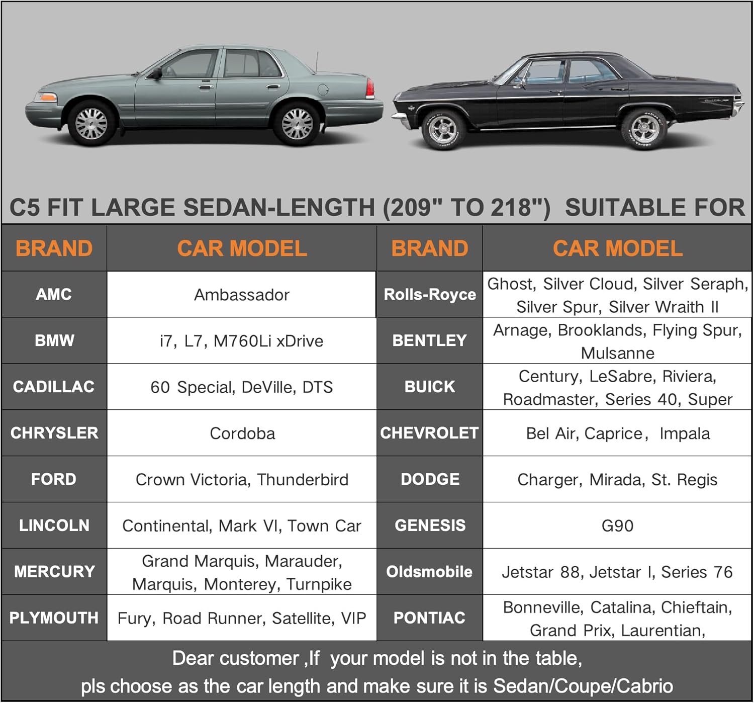 - ăDimension C5ăUniversal fit for large sedan Coupe Sports Car which length is 209 to 218 inch. (NOT FOR HATCHBACK/SUV). Come with a large enough and waterproof portable storage pocket to store the cover.