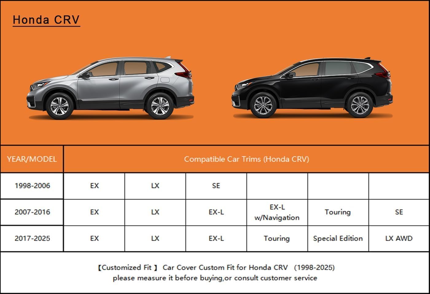 - ăSuitable forăâ Custom fit for Honda CRV CR-V (1995-2025). Come with a large enough portable bag to store your cover when you do not use.
