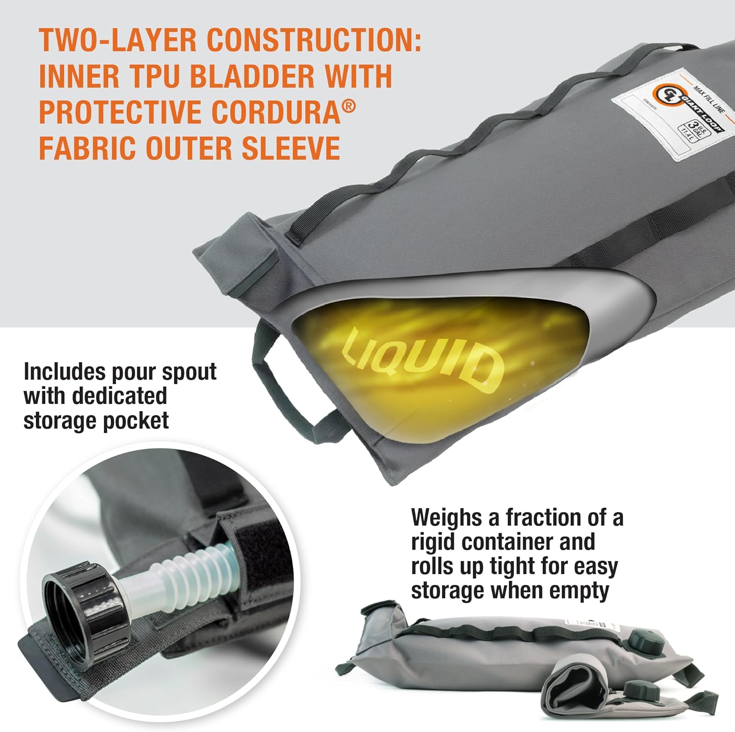 - SAFE TRANSPORT OF AUTOMOTIVE FLUIDS: Giant Loop's Armadillo Bag is a flexible, collapsible, lightweight and portable utility bladder for the safe transport and storage of liquid hydrocarbon products and other powersports and automotive fluids. It rolls up or packs flat when empty, making it convenient to carry around.