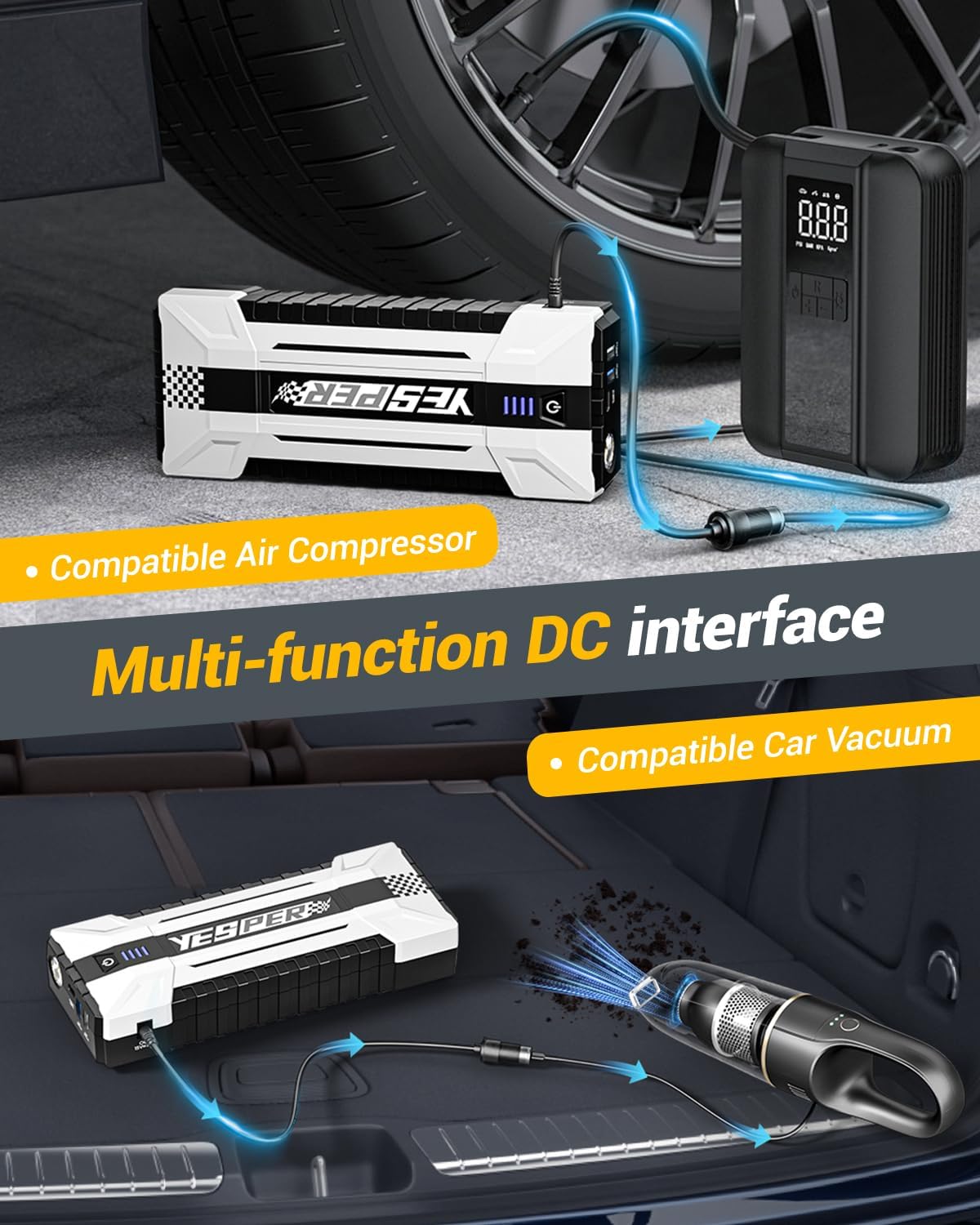 - DSLI IV INTELLIGENT CONTROL TECHNOLOGY - YESPER YJS40 car jumper starter portable. Compared with the previous generation technology, the reassembly of the DSLI IV structure and microcomputer control program increases the voltage by 30% to 14.8V, and the starting current peak value is up to 4120A, achieving 1 second car start. The powerful intelligent temperature control technology reduces the starting temperature, helping you start faster, stronger and safer