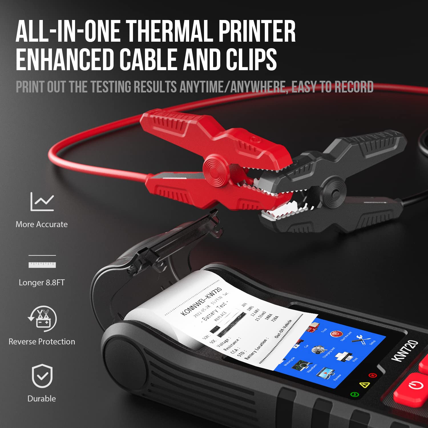 - 【LARGE COLOR SCREEN + ENHANCED CLIPS + THERMAL PRINTER】compared to other similar 12V battery testers, KW720 is the only battery analyzer that adopts a very large color screen and rugged design. It also upgraded the connection cable(8.8ft) and enhanced the clips to reduce the measurement error. Besides you can print the testing data at any time with the built-in thermal printer(paper included).