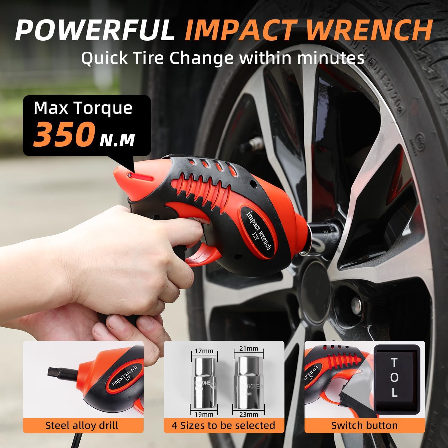 - High-Torque Impact Wrench: This electric jack features a 350N.M wrench with dual sockets . A powerful motor enables quick lug nut removal and 360Β° rotation