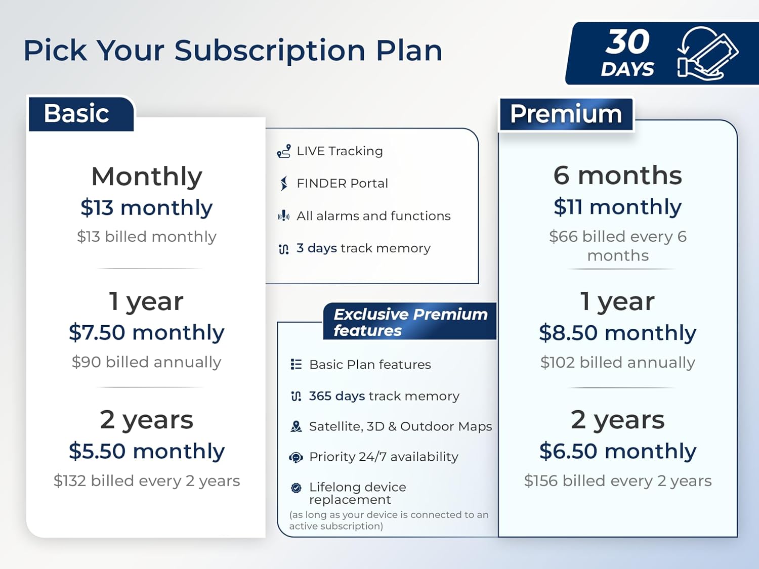 - SUBSCRIPTION: Includes a SIM card and offers a lifelong device replacement, along with 24/7 customer support in multiple languages. Control your locators with our free app compatible with Android and iOS and share it with the whole family. Choose between the Premium or Basic plans, with options from monthly to every 2 years, from $5.50 per month, with payment frequency depending on the duration of the subscription. See pricing details in images.