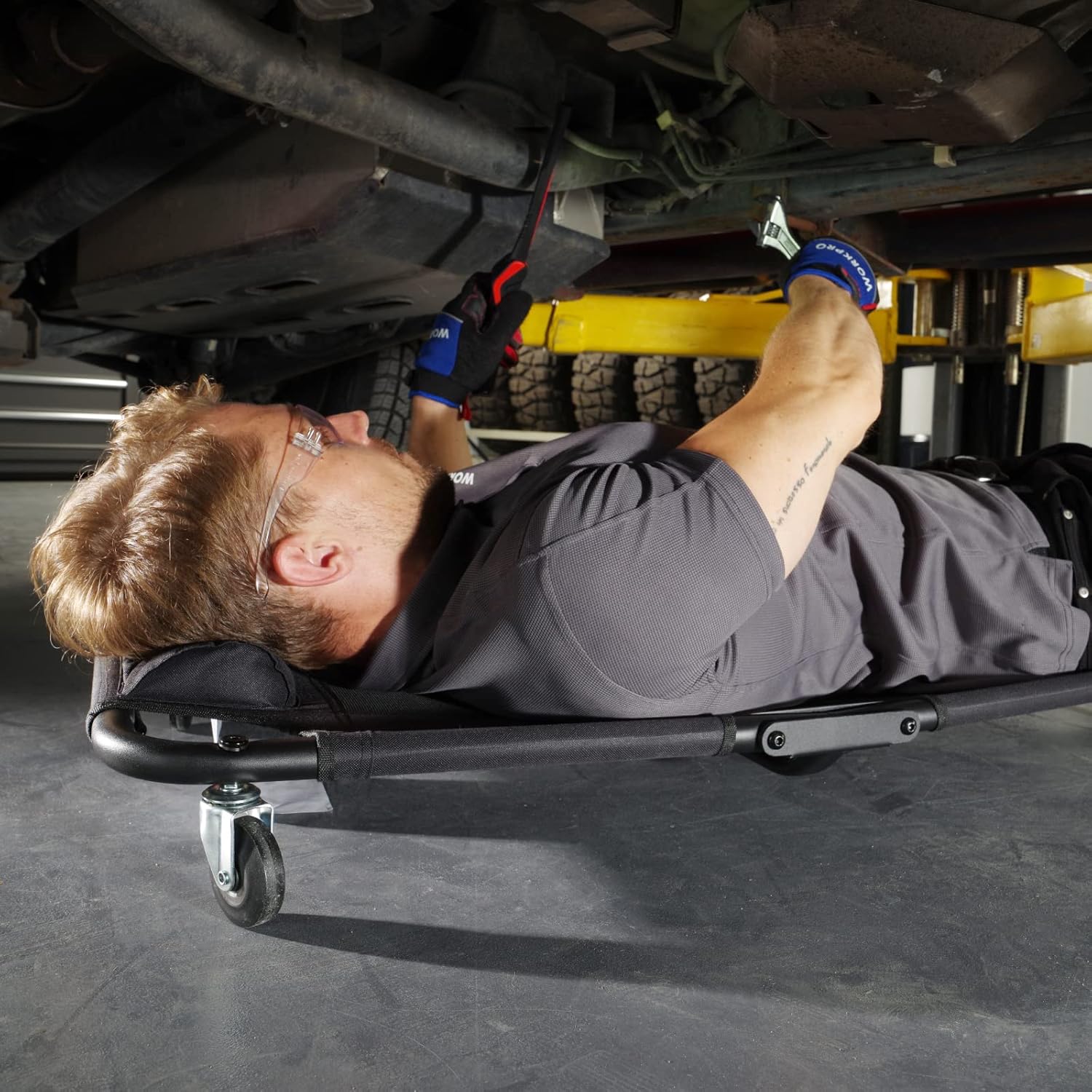 WORKPRO Foldable Mesh Creeper, 40-Inch Automotive Creeper with Padded Headrest and 4 Caster Wheels, 350 Lbs Capacity Rolling Garage Creeper, Black