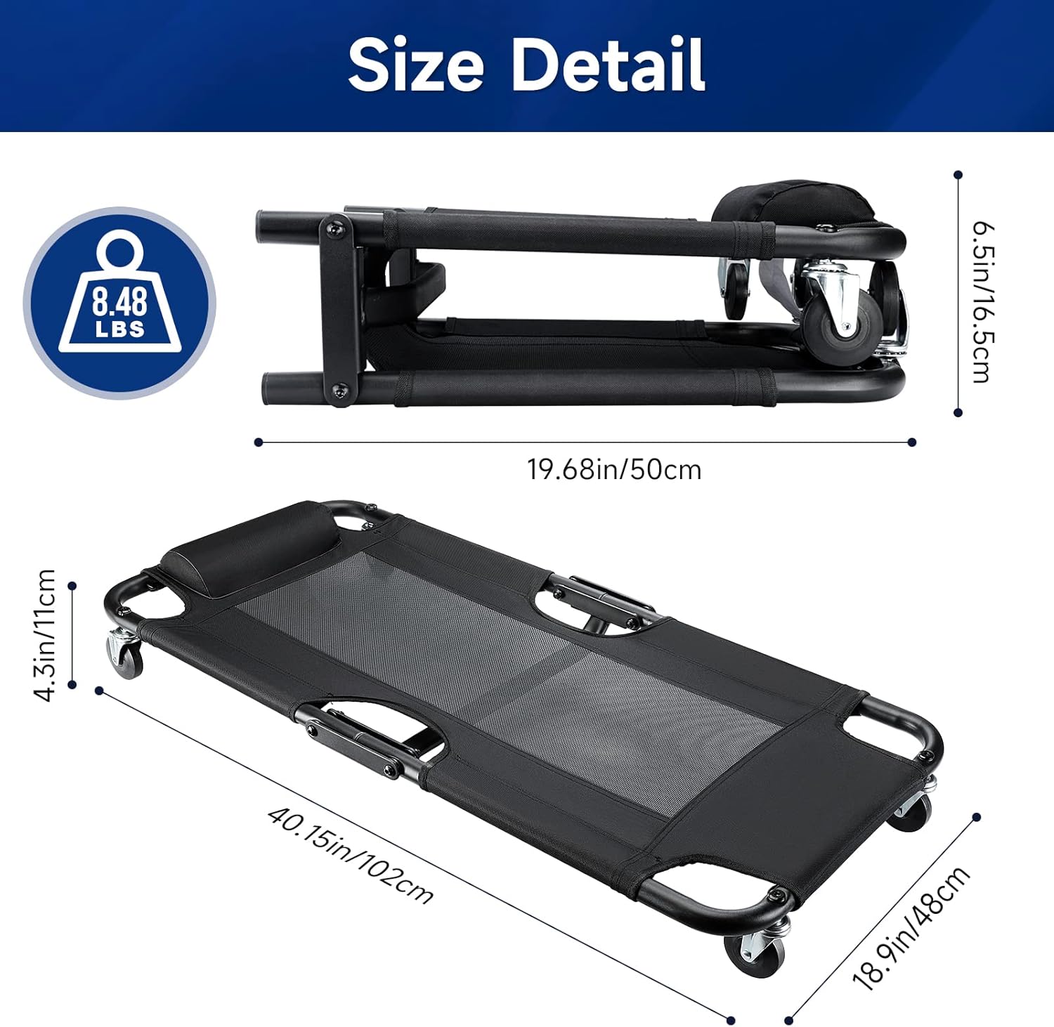 - Size and Weight: The expanded size of this Lightweight creeper is 40.15x18.9x4.3(inch) and folded size is 19.68x18.9x6.5(inch) and weighs only about 8.5LBS, the folded creeper is convenient to storage and transportation.