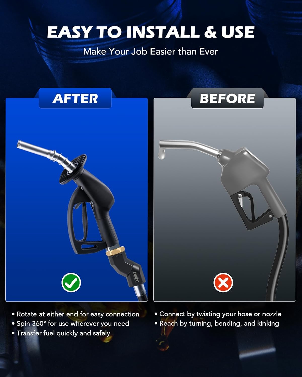 - MULTI-PLANE ROTATION: This 360 degree fuel hose swivel from Orion Motor Tech allows you to get the perfect angle, filling your tank or vehicle with greater safety and convenience