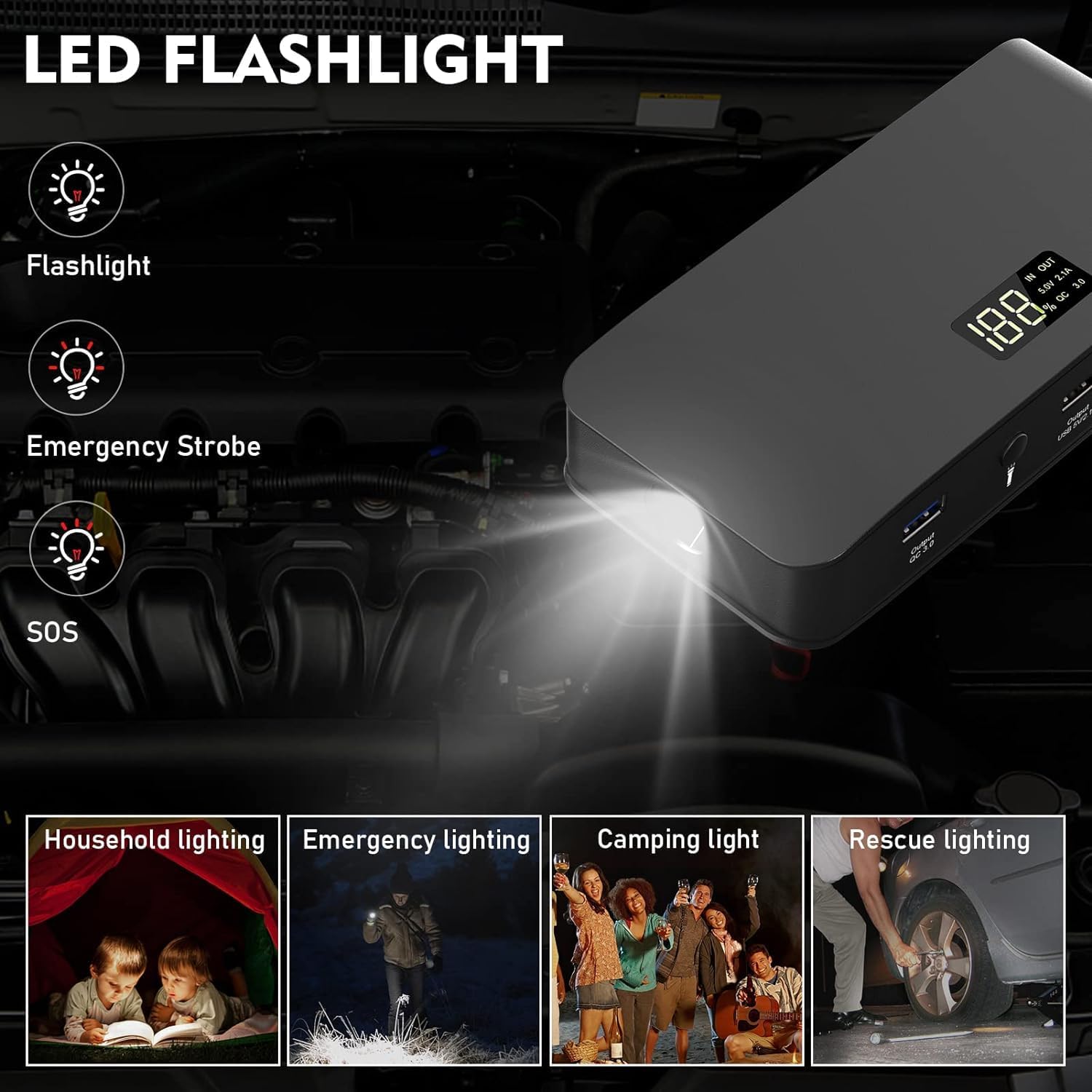 - ๐ใ3-IN-1 LED Flashlightใ - The portable battery jumper starters has a built-in LED flashlight with 3 modes (Lighting/Strobe/SOS) for emergency and outdoor adventures.