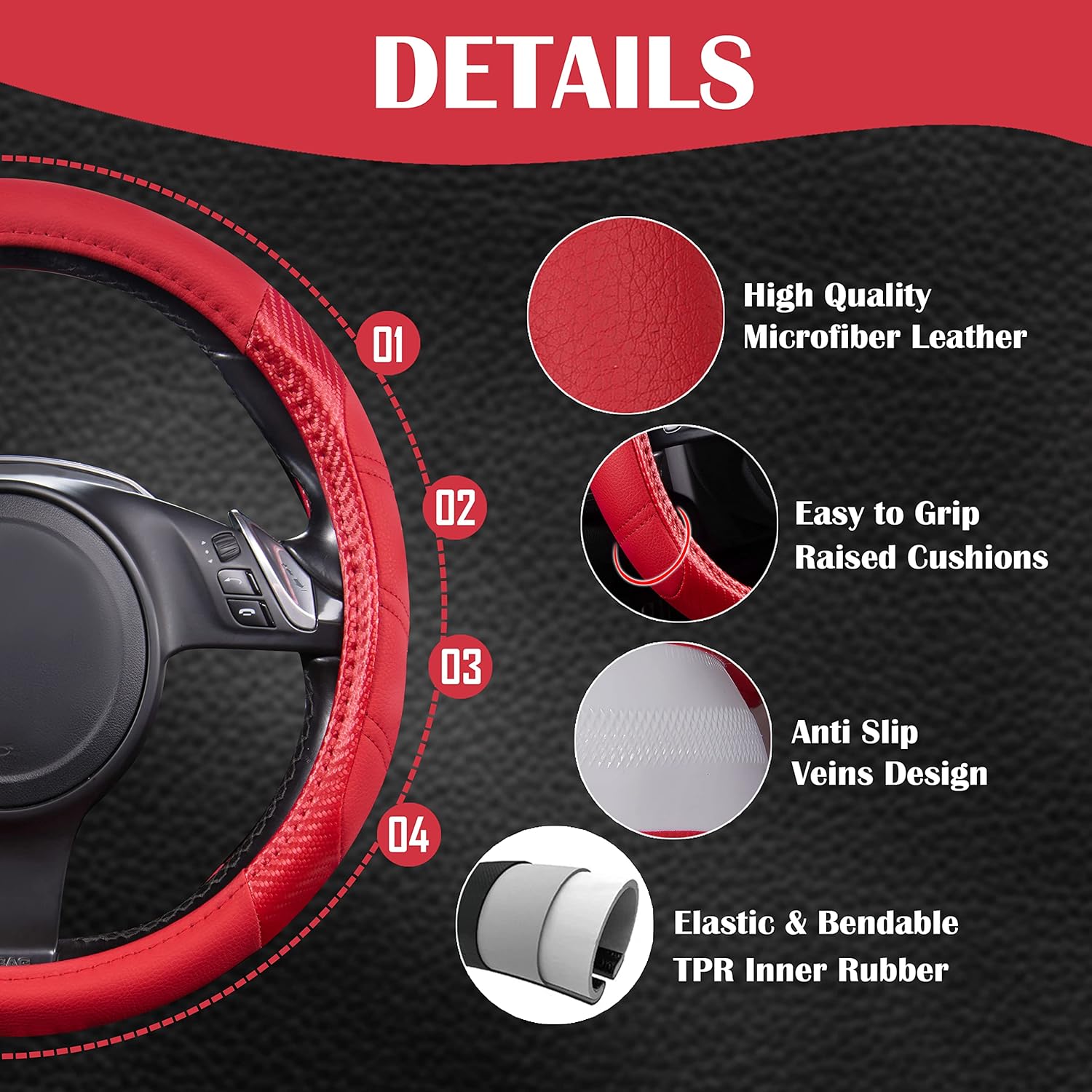 CAR PASS Line Rider Microfiber Leather Sporty Steering Wheel Cover 14.5-15 inch Universal Fits for 95% Truck,SUV,Cars, Anti-Slip Safety Comfortable Desgin (Red-Carbon Fiber)