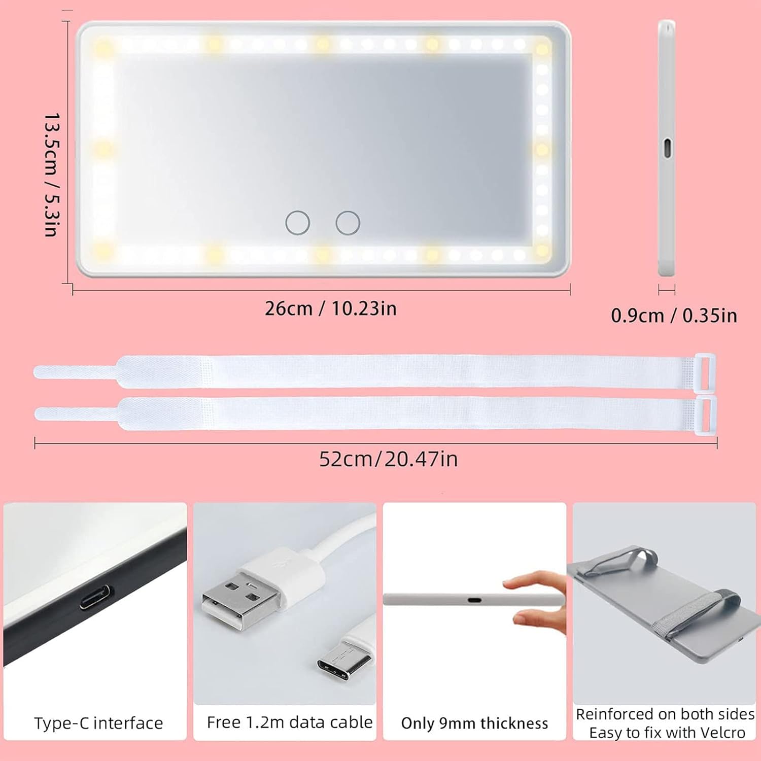 - [SIMPLE INSTALLATION] The size of this vanity sunvisor mirror for car is 10.25 (L) * 5.3 (W) * 0.4 (H) inches, which is suitable for most car, truck and SUV. This vanity car light up mirror uses aviation special textile elastic belt, which can stably fix the car visor mirror and is easy to install.