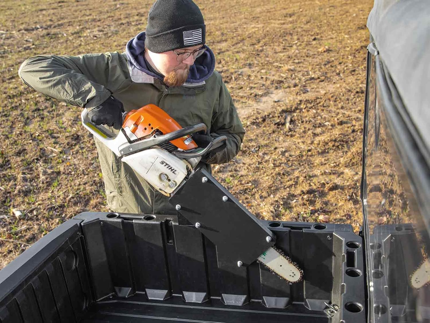 - Features: This Polaris Ranger chainsaw mount is made from durable, powder-coated UHMW. It can be installed either inside or outside of your bed, which gives you more control over your cargo space and accommodates all chainsaws up to 20β.