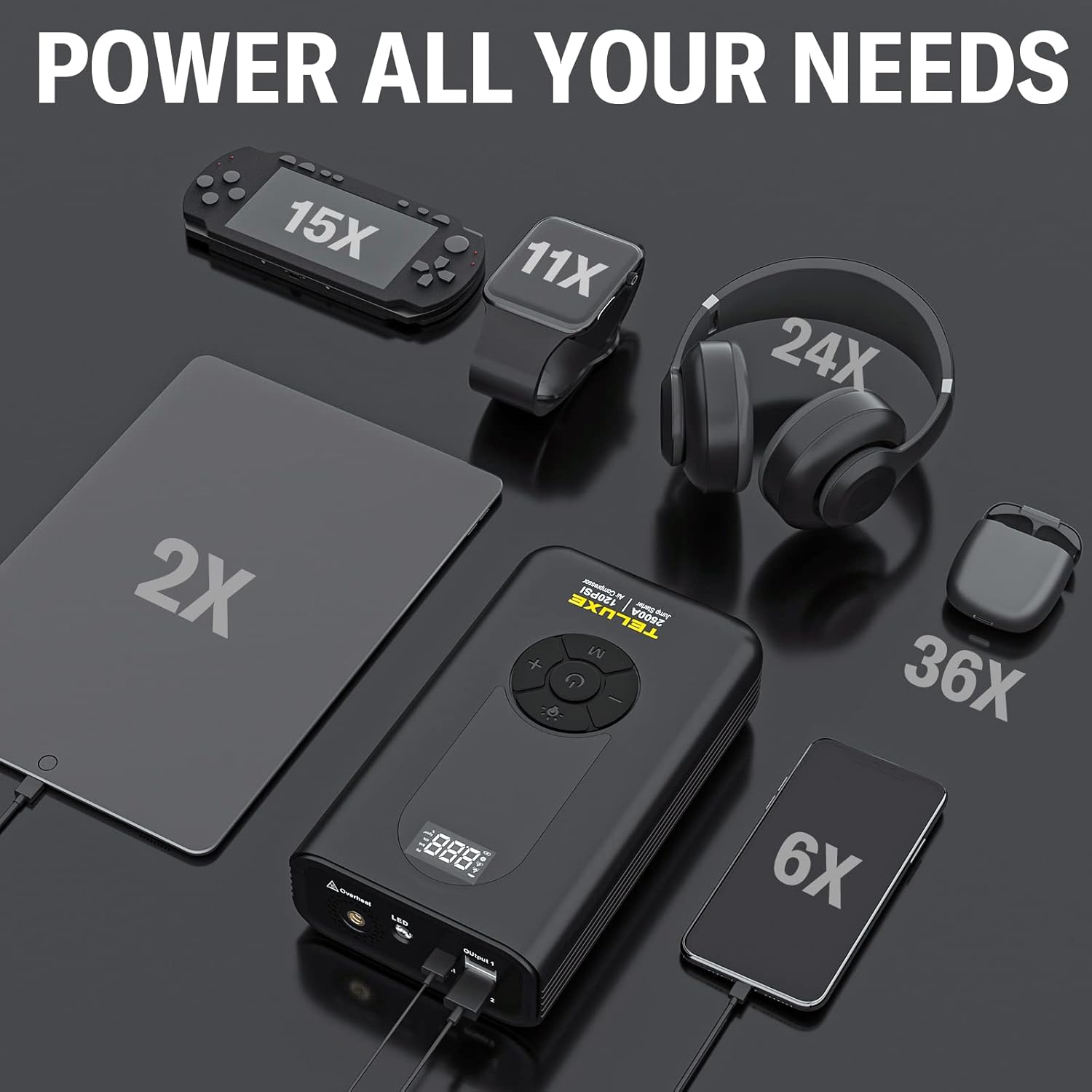 TELUXE Jump Starter with Air Compressor, 2500A 150PSI Car Battery Jump Starter with Digital Tire Inflator, 12V Lithium Jump Box for Vehicles, Car Battery Booster for 8.5L Gas or 6.0L Diesel Engines.