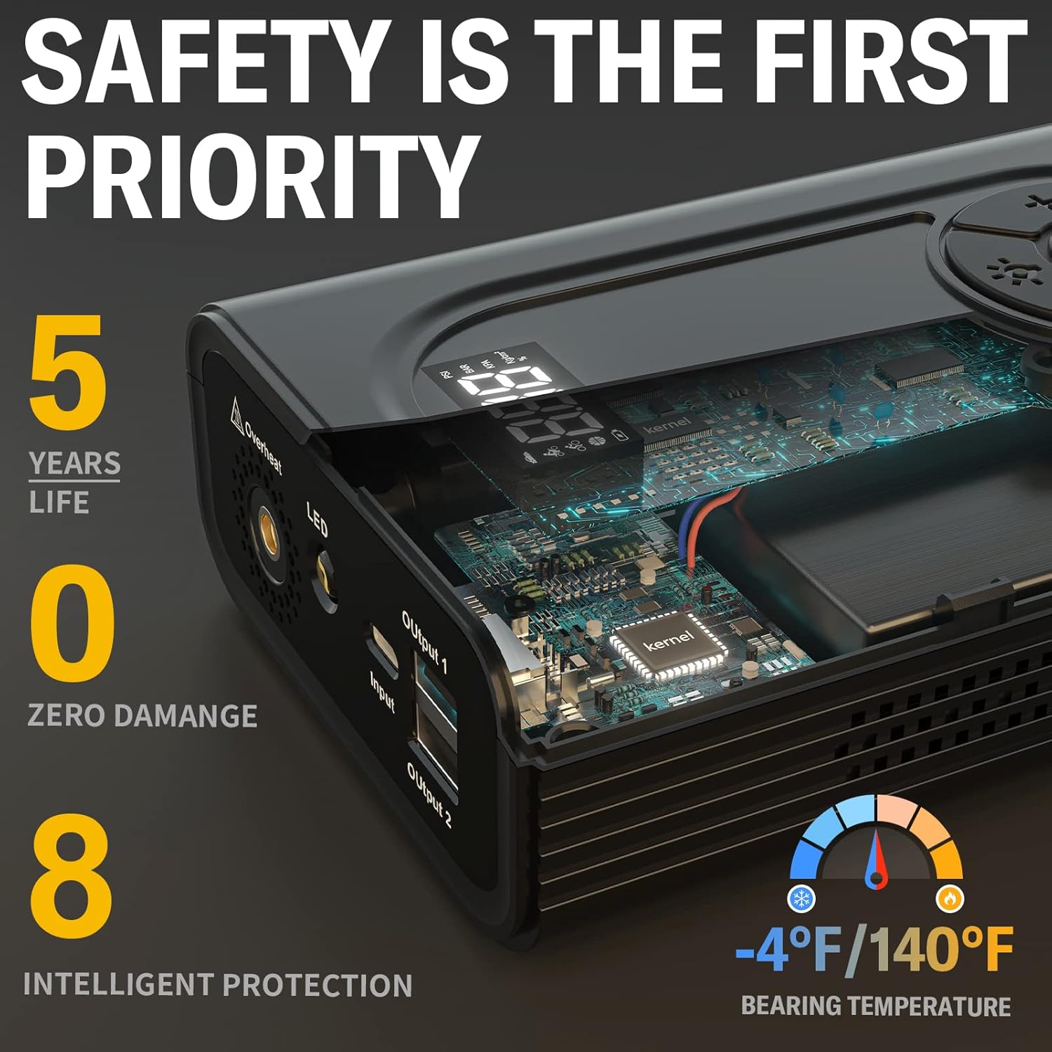 - ăLATEST QDSP TECHNOLOGYăWith the same starting battery capacity, our jump box equipped with the latest QDSP technology has 3-5 times the current of the old jump starter. At the same time, through the subversive innovation of the battery/assembly structure, the start-up temperature is reduced by 50% to achieve temperature balance and escort your safety.