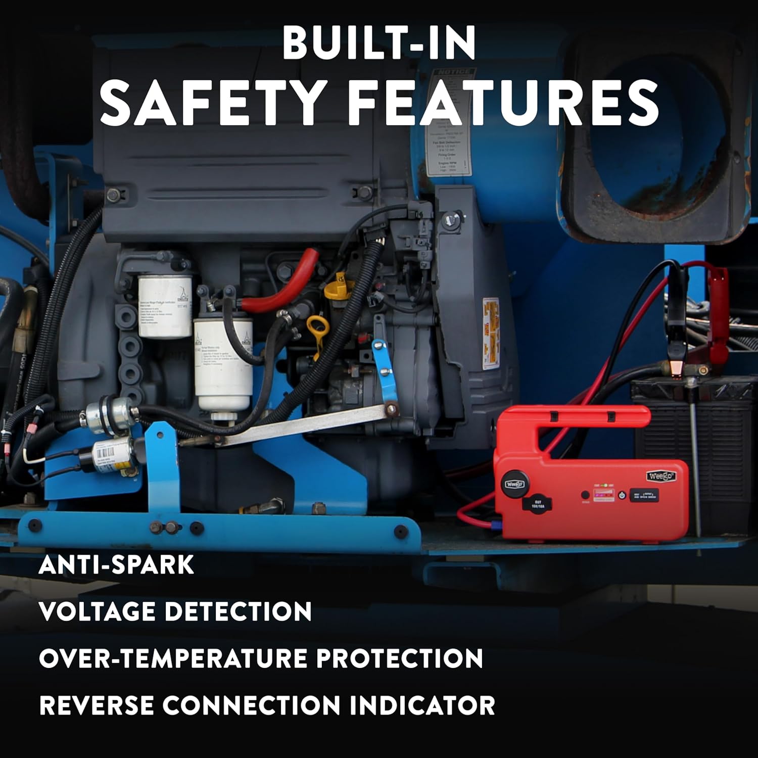 - SAFETY FEATURES: Weego C120 jump start battery pack includes built-in safety protections like anti-spark, reverse polarity, power surge and more. A series of lights and sounds guide you through jumps.