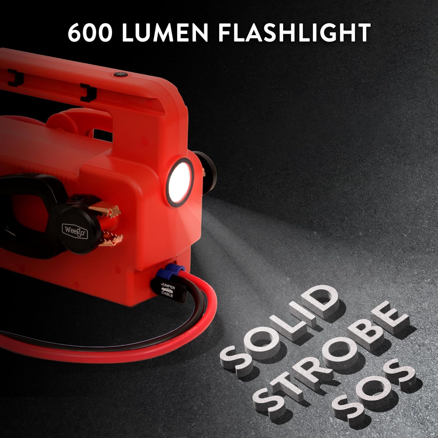 - LIGHTWEIGHT AND VERSATILE: Weego C120 jump starter battery pack weighs just 5.5lbs, contains a 600 lumen flashlight, and doubles as a portable power bank for USB and 12V devices and appliances.