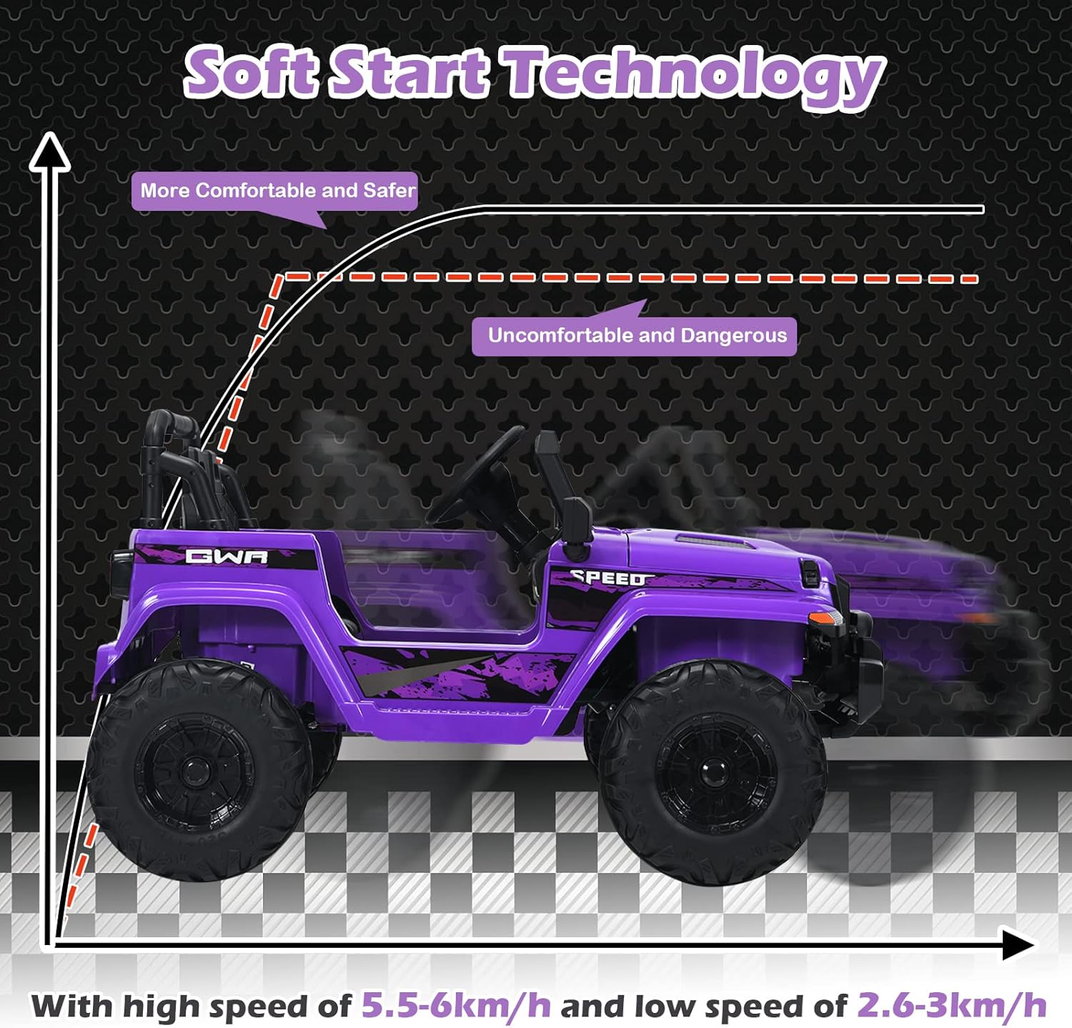 - REALISTIC DRIVING EXPERIENCE: Your kids can simply accelerate, decelerate or brake by operating the realistic non-slip foot pedal. Designed for small hands, the steering wheel has rounded edges and a comfortable grip, complete with horn and engine sound buttons. And the windshield and rearview mirror also greatly increase the sense of reality. The stylish body of the ride on jeep car is made of safe and high quality material, which is firm and durable. No child will refuse this perfect gift.