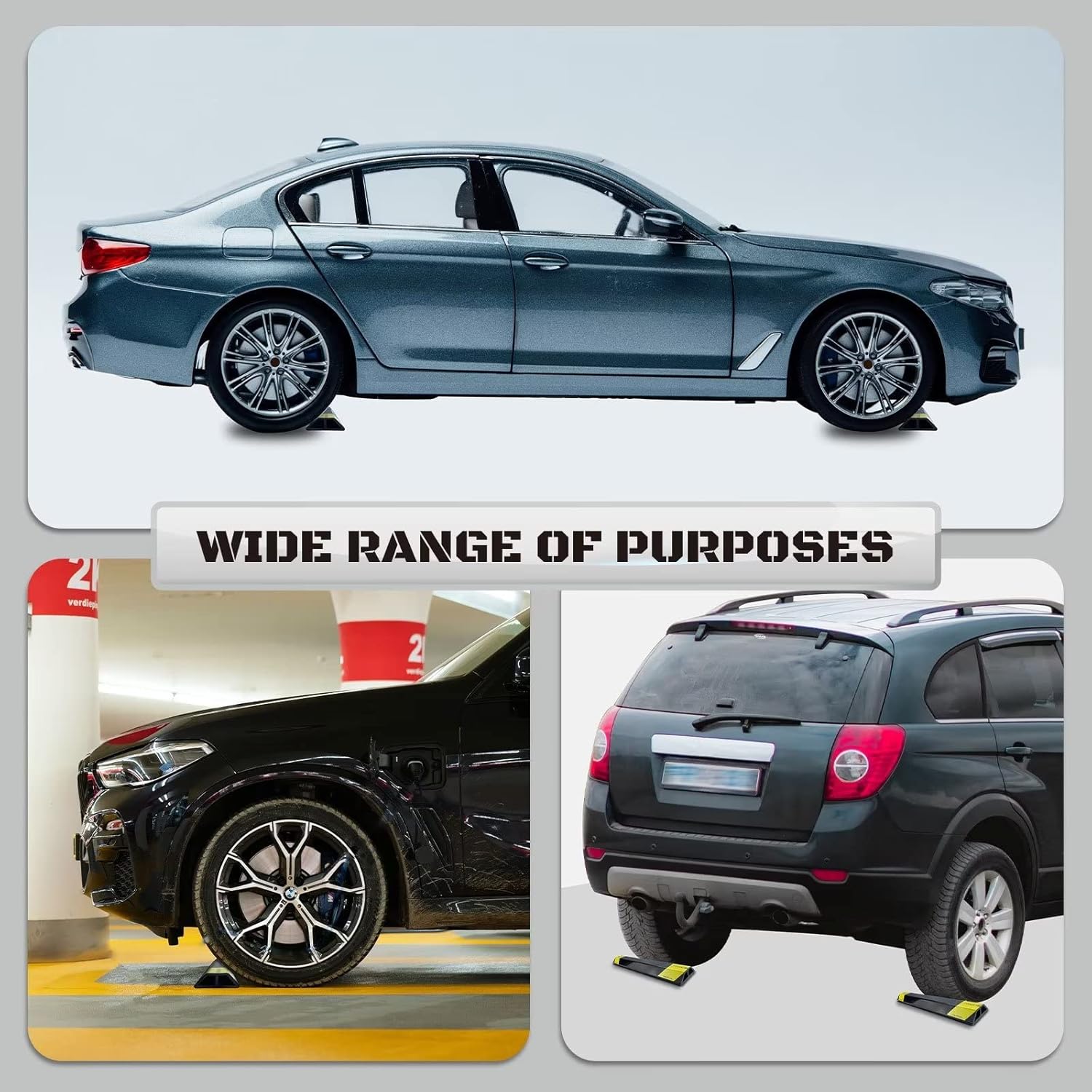 - ECO-FRIENDLY MATERIAL: Our 16 inch parking aid for garage vehicle is made of environmental protection material with no strong odor like other rubber products. The wheel stops are with conspicuity yellow safety stripes to improve the visibility