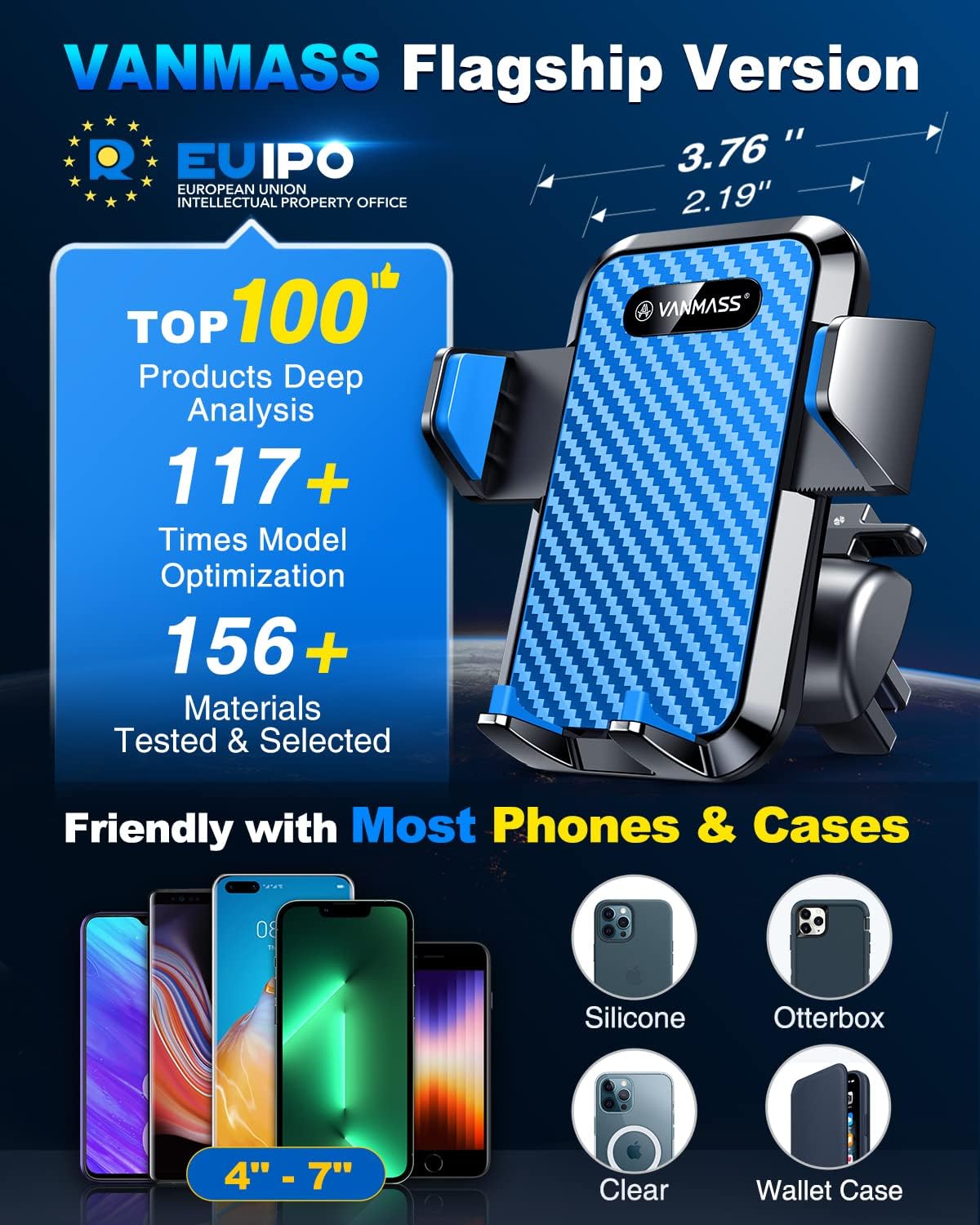 VANMASS Universal Car Phone Mount,【Patent & Safety Certs】 Upgraded Handsfree Stand, Phone Holder for Car Dashboard Windshield Vent, Compatible iPhone 13 12 11 Pro Max Xs XR X 8, Galaxy (Blue)