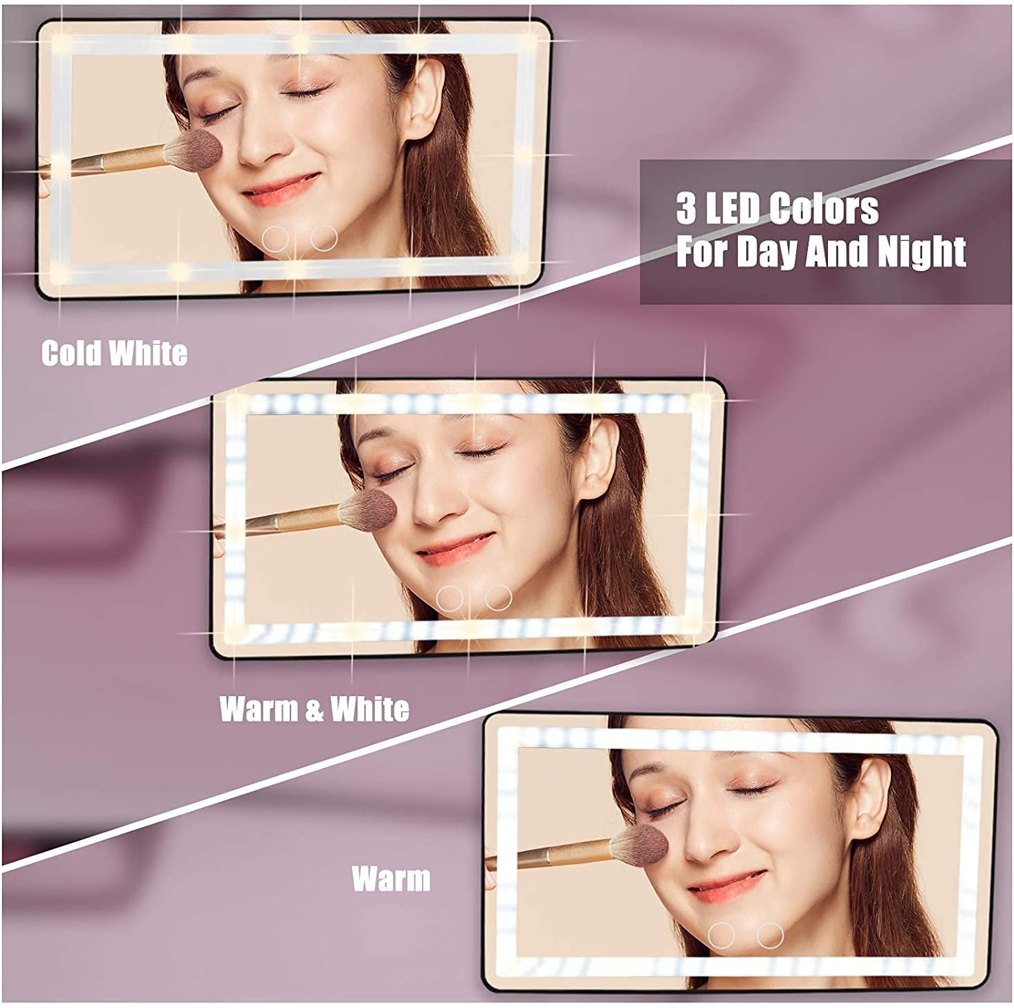 - ăDIMMABLE BICOLOR LED LIGHTSă-The car makeup mirror has 12 yellow lights and 48 white lights, which is 40% brighter and 60% less energy than normal bulbs. Short press the 2 sensor switches to replace 3 light colors: white, yellow, white and yellow. Long press for dimming according to what you need. 2500-6500K color temperature is equivalent to outdoor sunlight, the makeup is naturally no difference.
