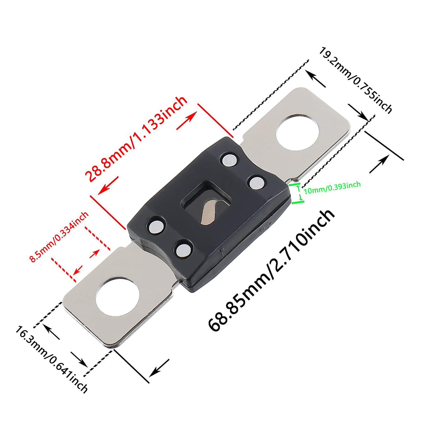 • Product: ANM fuses, bolt auto fuses, time delay (slow blow), current 100A, 32V DC, replaces MEGA/AMG fuse.