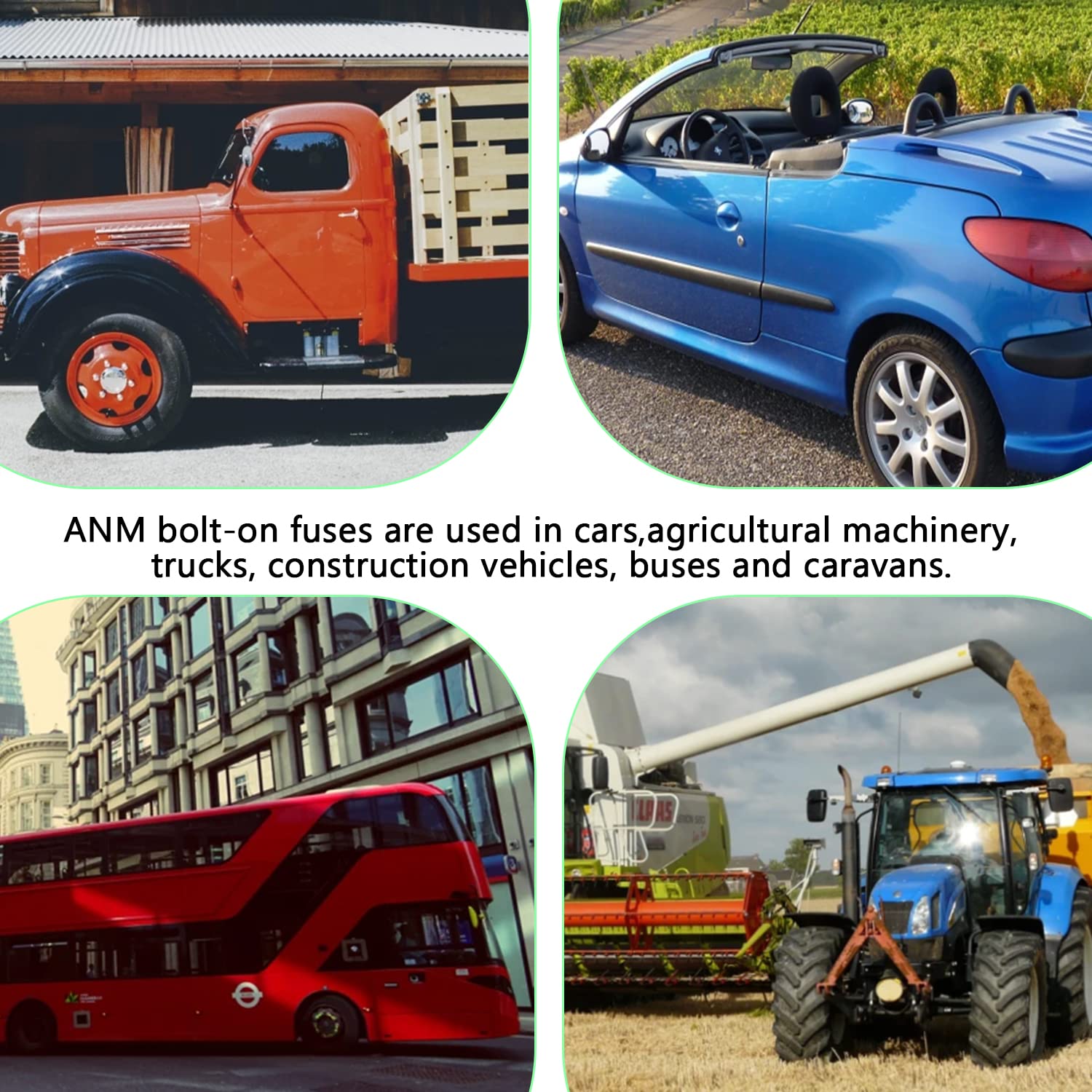 • Application: ANM bolt-on fuses are used in cars, trucks, agricultural machinery, construction vehicles, buses and caravans.