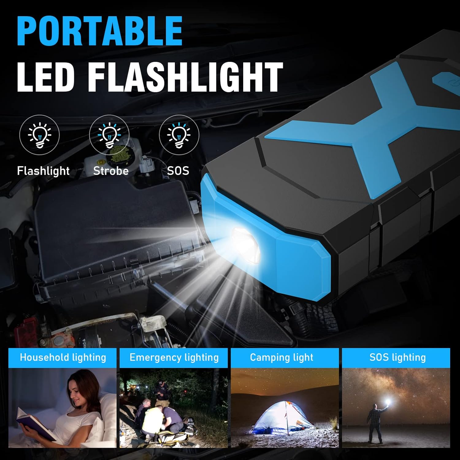 - COMES WITH 8 SAFE SYSTEM - Safe and easy to use car portable jump starters for car battery without the worry of incorrect connections or sparks. The self jumper cables are constructed with all-metal clamps to prevent breakage caused by long-term use. And the car jumper starter portable has 8 protections, including overcurrent protection, overload protection, overvoltage protection and overcharge protection, Totally safe for anyone to use with any 12V drain or dead battery
