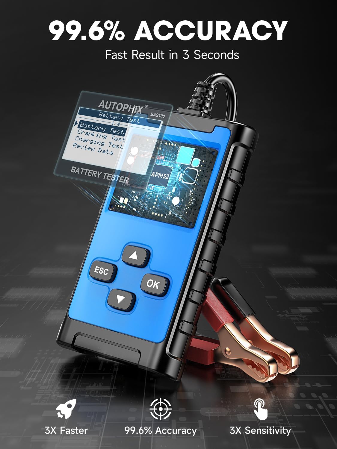 - Know You Battery Before Replace: Stop guessing and avoid unnecessary $300 battery replacements. BAS100 car battery tester delivers a quick and reliable check of your battery's State of Health (SOH) and State of Charge (SOC). It also runs cranking and charging system tests, helping you identify whether the issue lies in the battery, alternator, or starter—before you head to the repair shop.