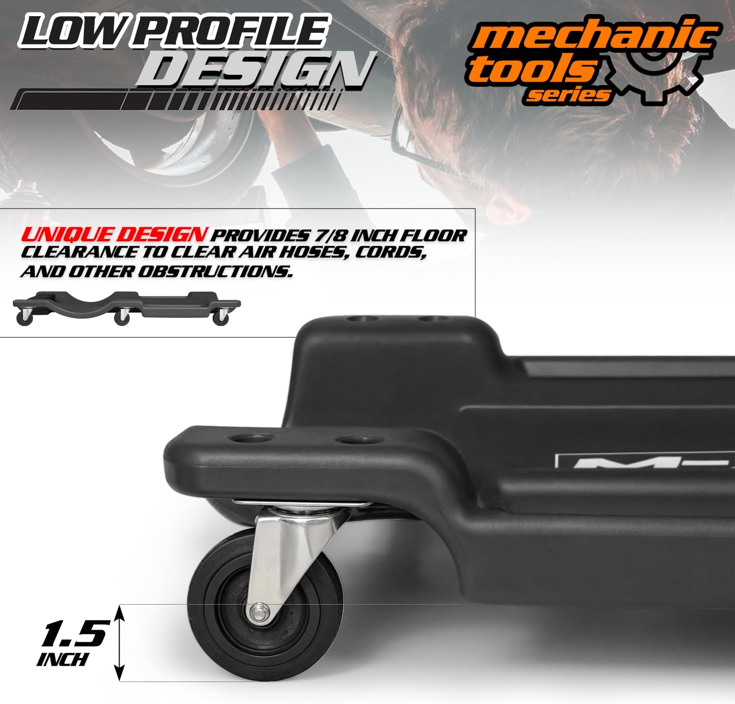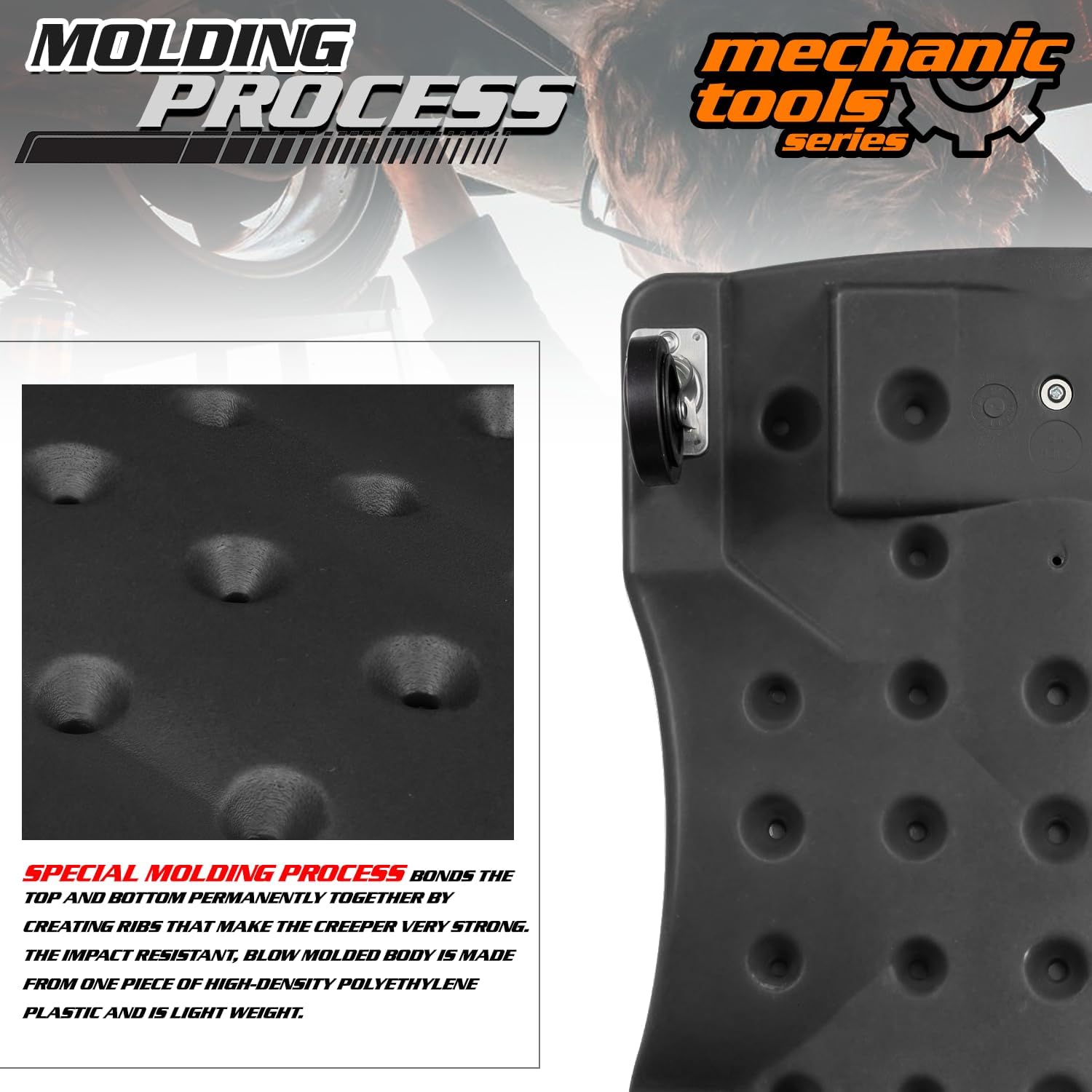 - Swivel Casters - This plastic creeper features 6 multi-terrain swivel casters, which are industrial strength with oil, chemical, and grease resistant. With caster size of 2.5", it provides with the extra maneuverability.