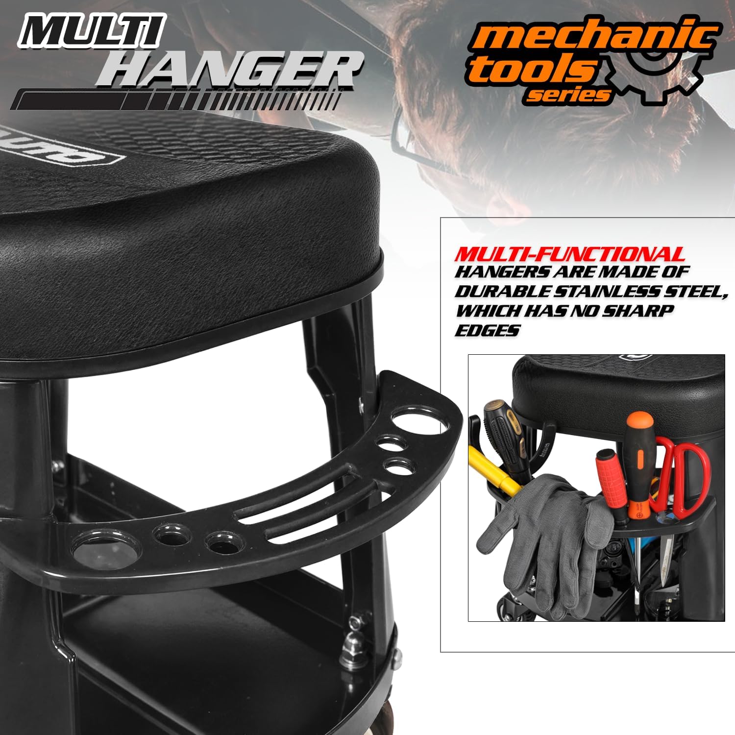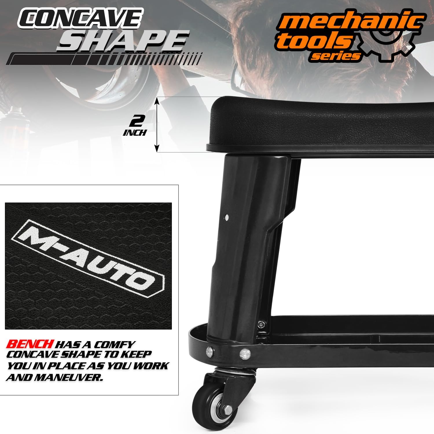 M-AUTO Heavy Duty Garage Rolling Work Seat 300LBS Capacity Mechanics Stool with Wheels, Rolling Work Seat with Equipment Tray and Tool Rack, Rectangle Seat Mechanic Roll Chair, Black