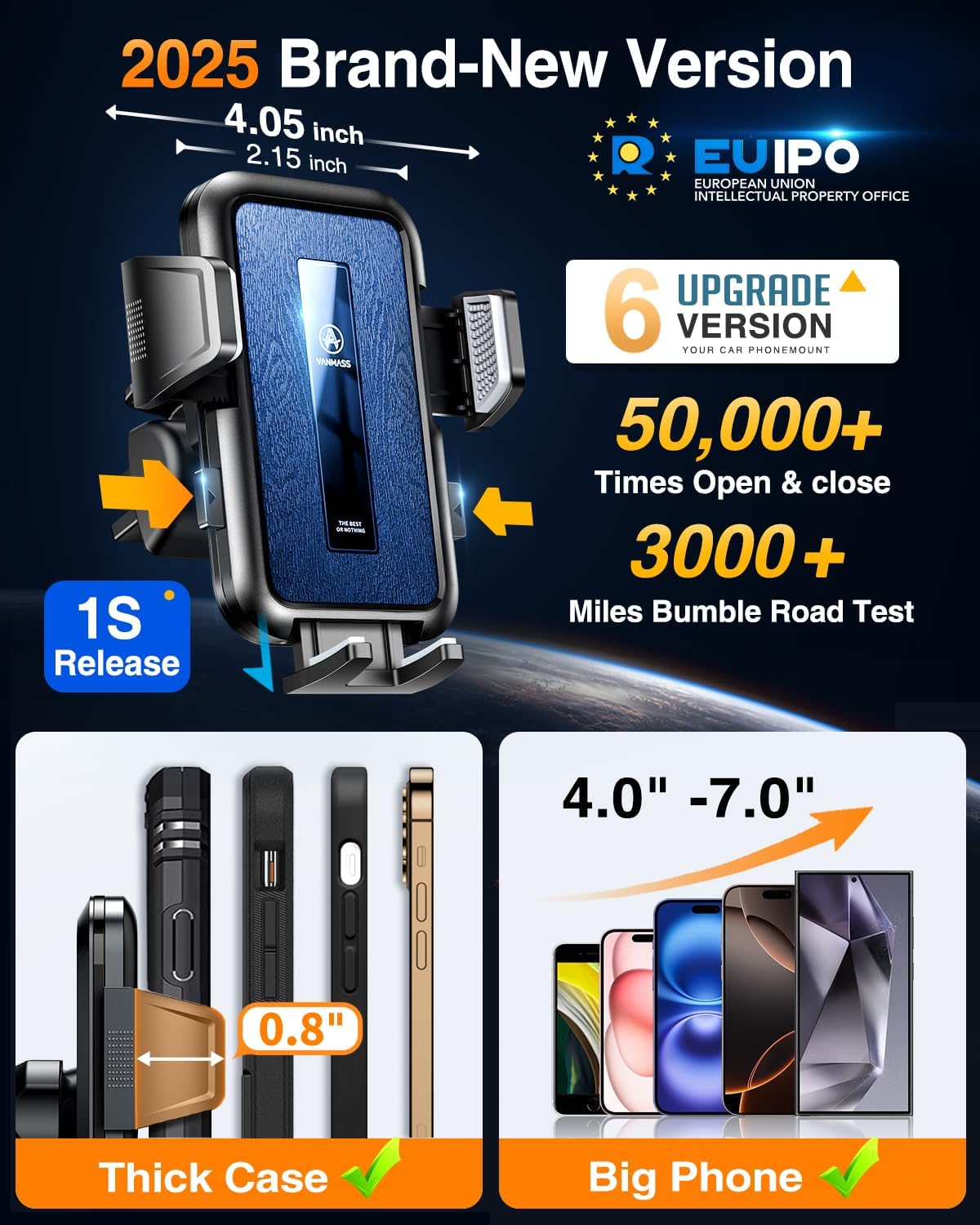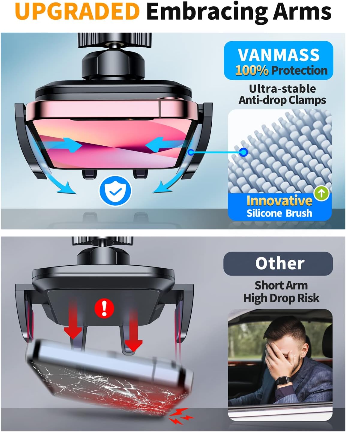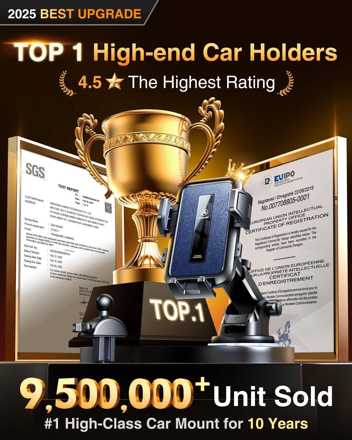 - [2025 VANMASS Best Upgrade Car Phone Holder-Flagship Version] Enjoy the highest rating car phone mount in the US. VANMASS real high-end cell phone mount trusted by 9,500,000 users over 8 years. Designed by world-class professional team. It took 8 years to analyze the top 200 products, optimize 365 models, and test 20,900 kinds of material. We are proud to receive the world-leading CP65/ REACH/ ROHS safe certifications