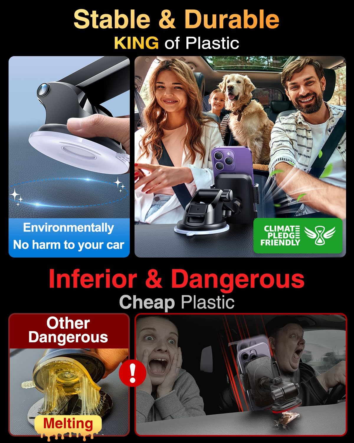 - [Materials are the Key to Everything] We always stand out by Quality & Eco-friendly: Significantly different from cheap plastic with eco-damage. VANMASS car phone mount made of green, odorless and sturdy materials. After 8 years of R&D & 8,000 kinds of materials tests, we finally found the BEST materials for Extreme Driving Condition from 20,900 kinds of materials, withstanding temperatures from extreme -40~194℉