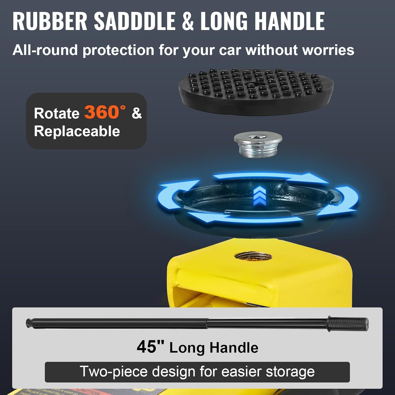 - Secure and Carefree: A rubber saddle provides maximum protection to your vehicle! The 360Β° rotatable saddle can be detached and replaced. Thanks to the leverage principle, the 45 in/1145 mm long handle makes lifting easier. With the two-piece design, the handle can be disassembled when stored, taking up little storage space.