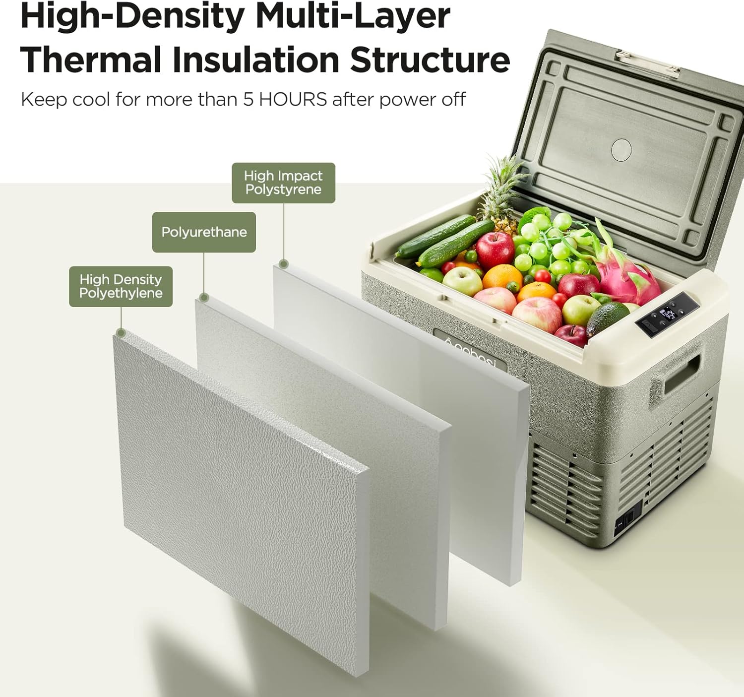- EFFICIENT REFRIGERATION&COMPACT SIZE&ENOUGH CAPACITY: AAOBOSI 12v refrigerator uses a state-of-the-art compressor with advanced 3D refrigeration technology, allows the portable refrigerator to achieve faster cooling( from 68℉ to 32℉ within 15 minutes) and save energy, and the noise of the compressor is lower than 45dB when it is running. Truck refrigerator offers a generous 32 quart (30L) capacity allows you to store all kinds of food according to your needs.Whether it's a picnic or out of town, you don't need to worry about food and beverage problems, perfect for family trips!