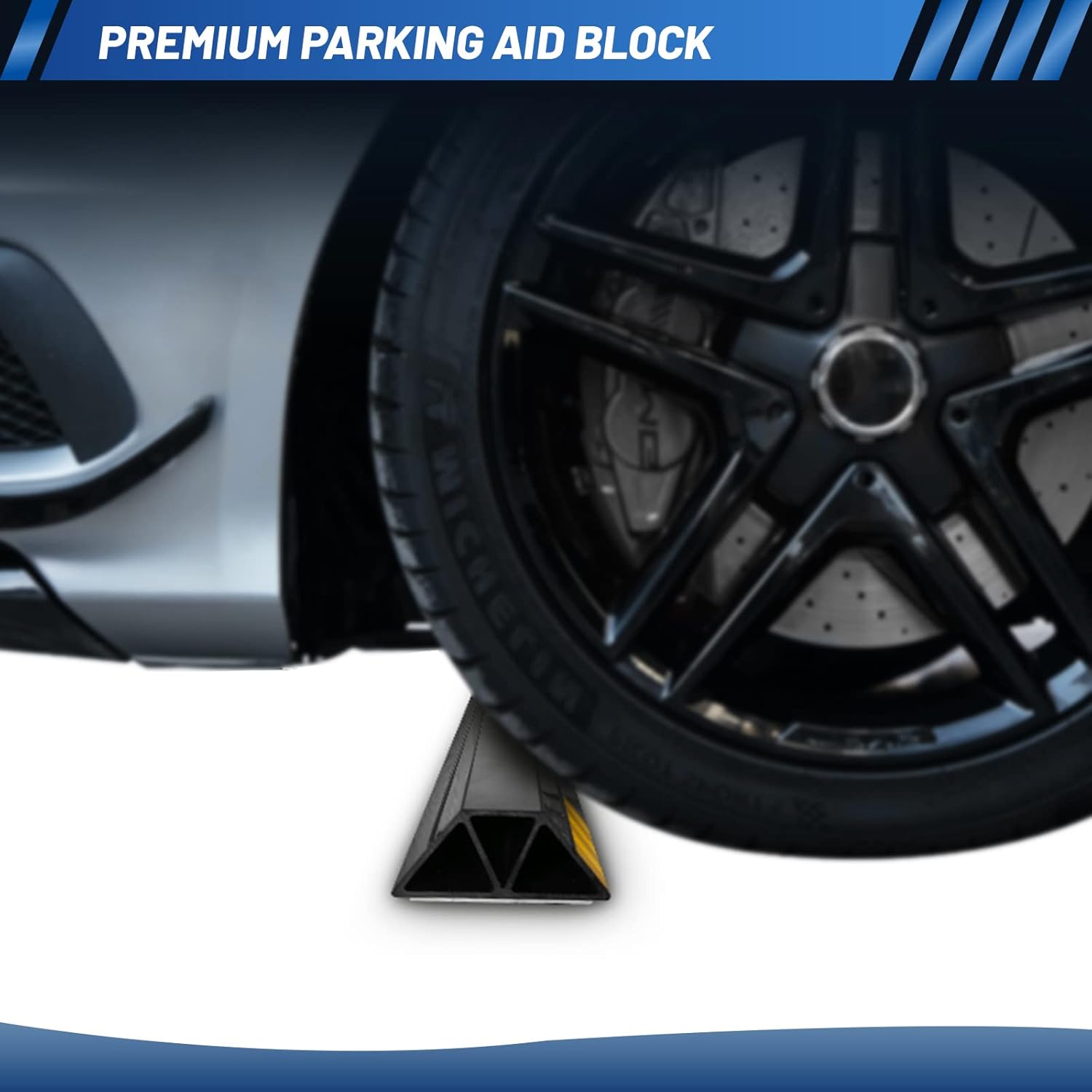 - [ECO-FRIENDLY MATERIAL]: Our 16 inch parking aid for garage vehicle was made of environmentally friendly materials with no strong odor like other rubber products. The wheel stops are with conspicuity yellow safety stripes to improve the visibility.